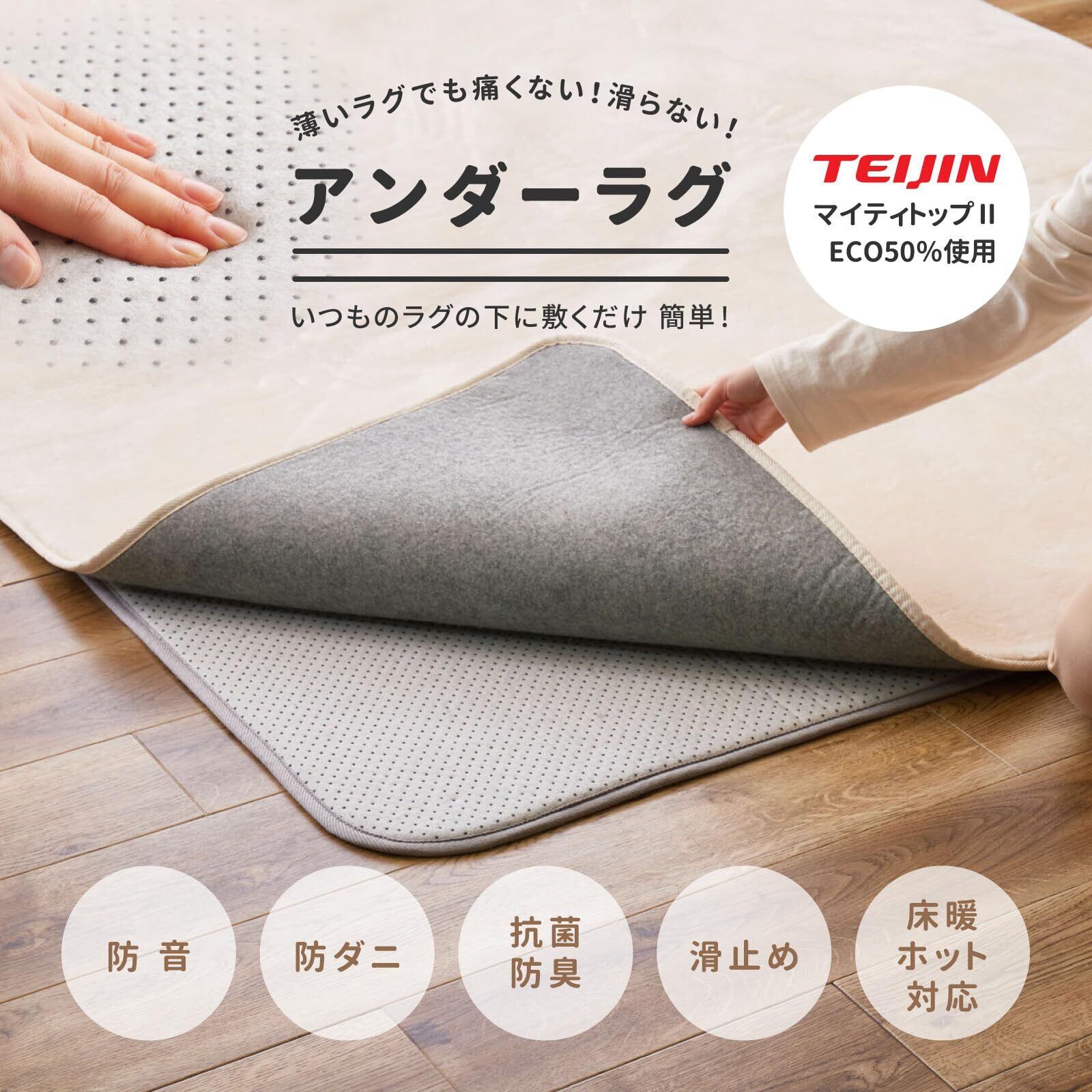 ラグやカーペット、マルチカバーなどの下に敷く下敷きラグです。両面滑り止め付きでズレにくくなっています。ウレタン入りで程よい厚みとクッション性があります。いつものラグにプラスするだけで、触り心地がよくなったり、床からの冷えも抑えてくれる有能アイテムです。
