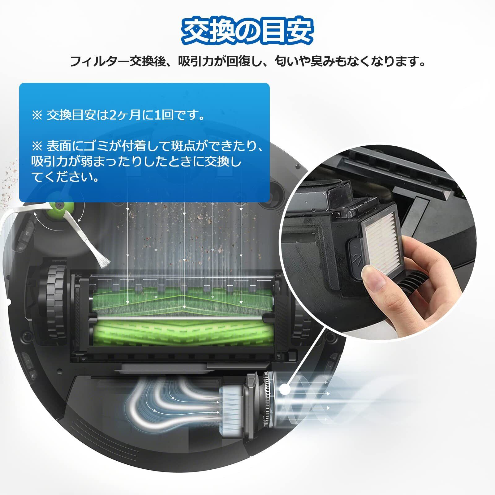 【交換目安】2ヶ月、使用環境により交換時期に差が出ます。表面にゴミが付着して斑点ができたり、吸引力が弱まったりしたときに交換してください。