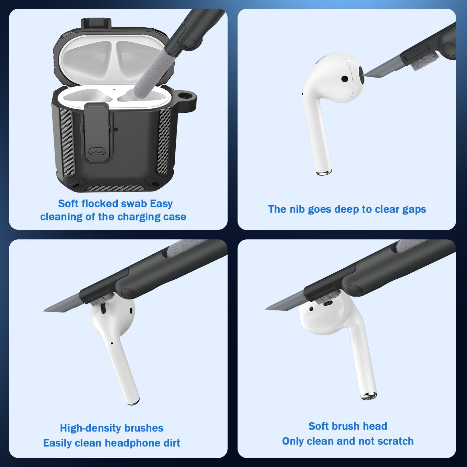 RFUNGUANGO AirPods 第 2 世代ケースカバー クリーナーキット付き ミリタリーハードシェル保護アーマー ロック付き AirPod Gen 1&2 充電ケース用 フロント LED 可視 ブラック