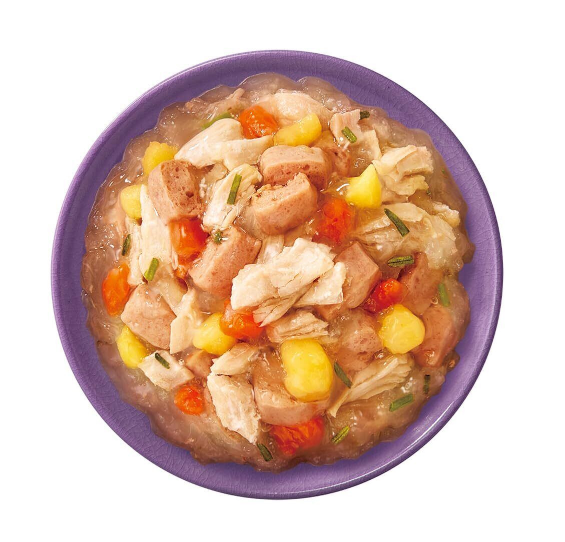 ●原材料:肉類(鶏肉、ささみ、ラム、鶏レバー等)、野菜類(にんじん等)、さつまいも、油脂類(ひまわり油等)、小麦、食塩、ハーブ、増粘多糖類 ●成分:タンパク質:7.0%以上、脂質:1.5%以上、粗繊維:2.0%以下、灰分:2.0%以下、水分:90.0%以下 ●代謝エネルギー:30kcal/袋