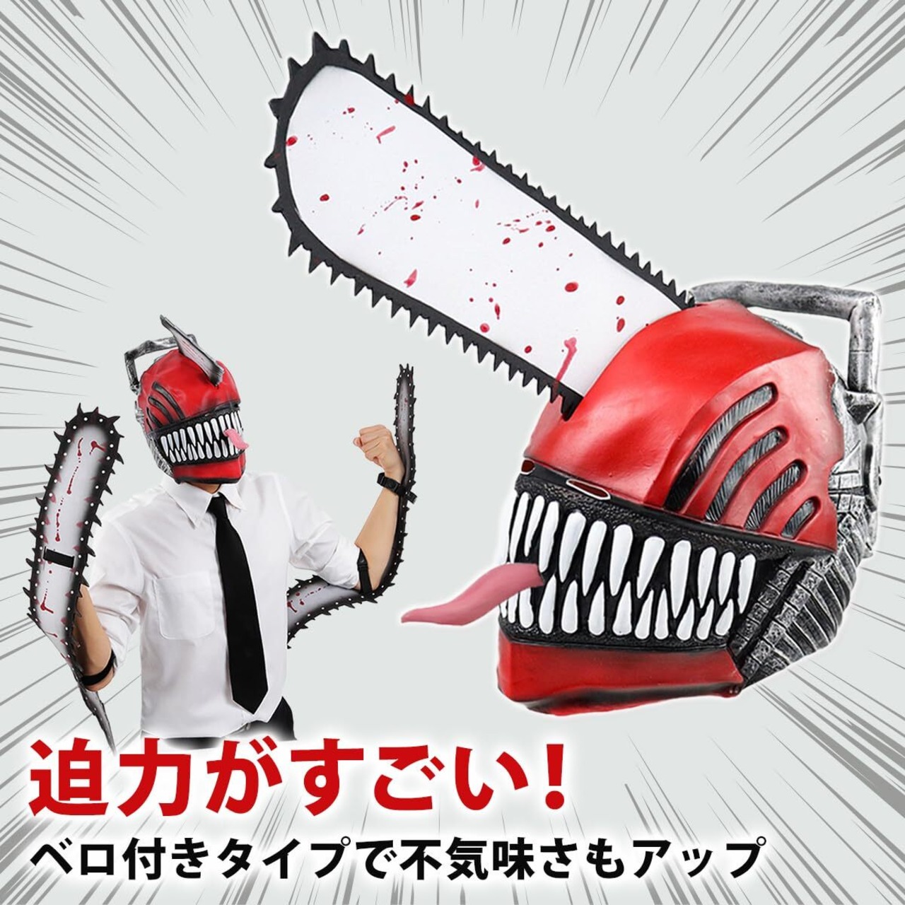 【ハロウィン仕様】頭のチェンソーに血の演出を加えて、ハロウィンのコスプレにぴったり誰もが知っている人気アニメなので、コスプレの中でも一番目立つこと間違いなし。