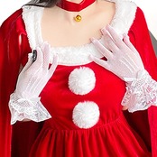 【フワフワなデザイン】サンタクロースをベースにした女性らしいデザインのワンピースです。ワンピースにケープが付けていて、可愛らしさと同時に華やかさを兼ね備えています。レース柄の手袋で,高級感を演出します