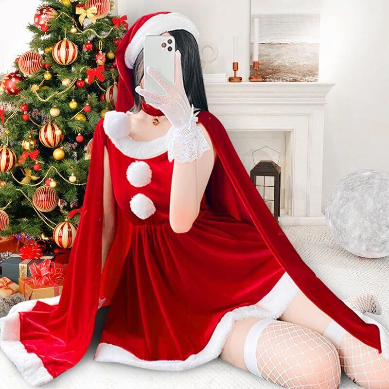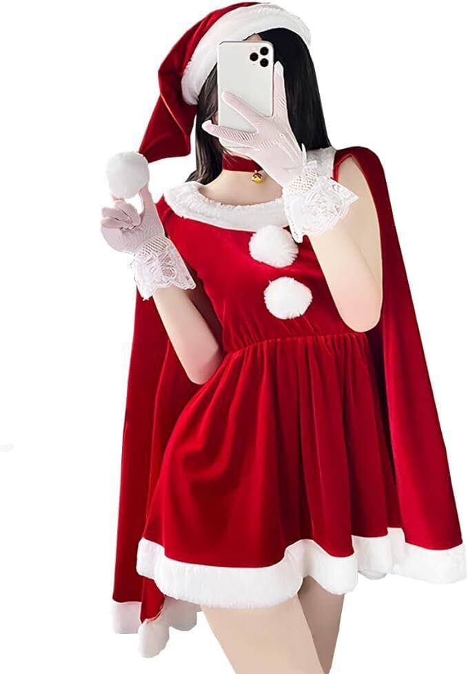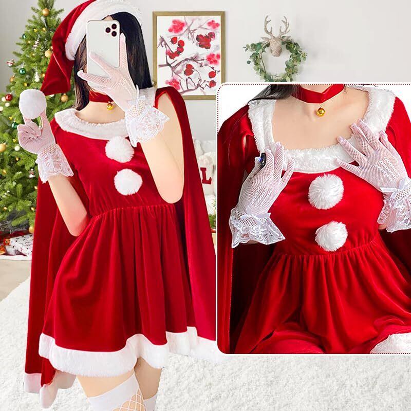 【雰囲気満点セット】ケープワンピース*1、サンタ帽*1、手袋*2、首輪*1。かわいいサンタクロースに変装できる4点セット!ワンピースにケープが付けていて、可愛らしさと同時に華やかさを兼ね備えています。