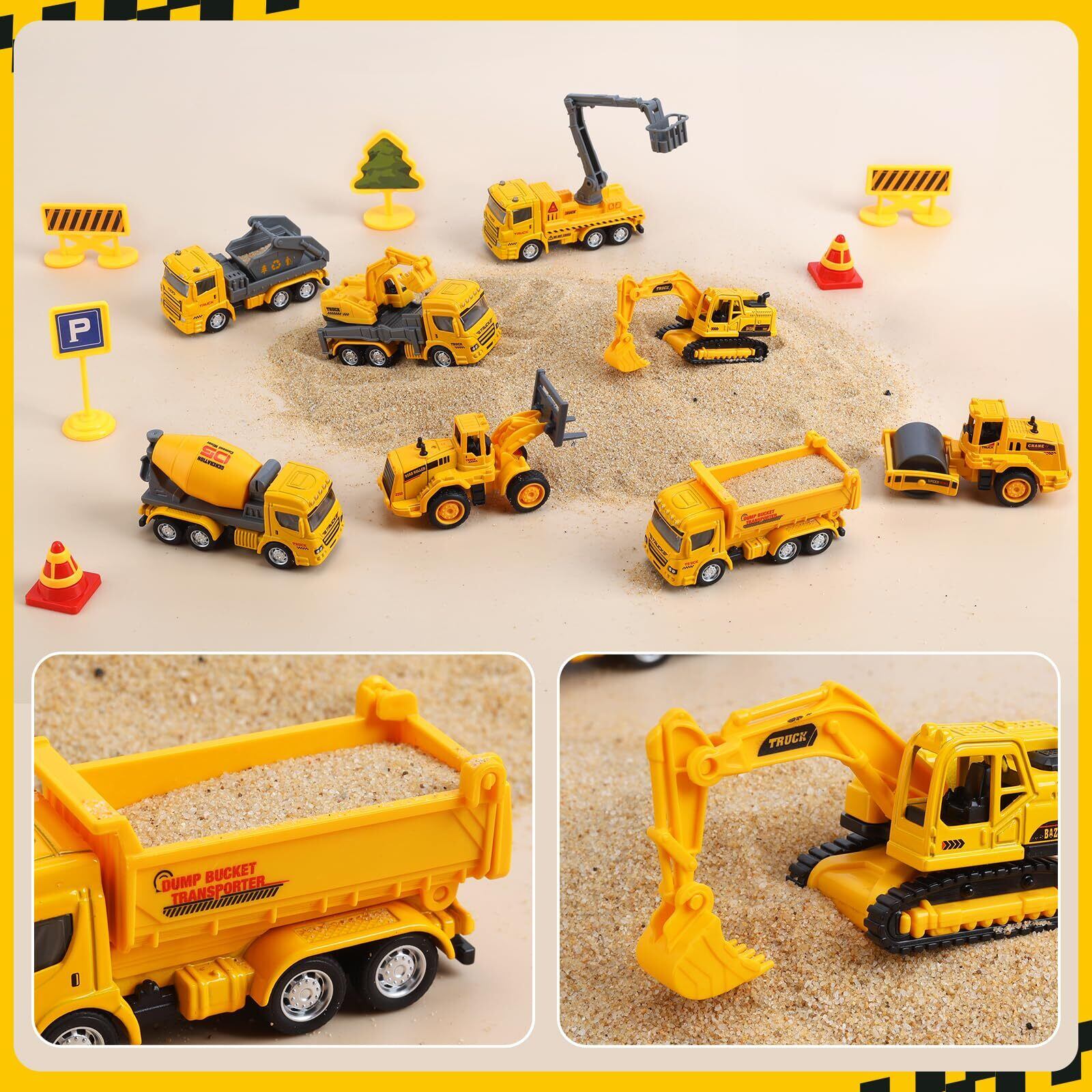 【豪華な建設車両おもちゃ22点セット】ショベルカー1台、エクスカベーター1台、ミキサー車1台、産廃トラック1台、ロードローラー1台、ダンプカー1台、メンテナンス車1台、フォークリフト1台、クレーン1台、プレイ地図、道路標識など、計22点の建設用おもちゃが含まれています。このセットは、豊富な内容を備えており、リアルな建設現場を再現することができます。さらに、電池を必要とせず耐久性があり、子供たちは長時間楽しむことができます。