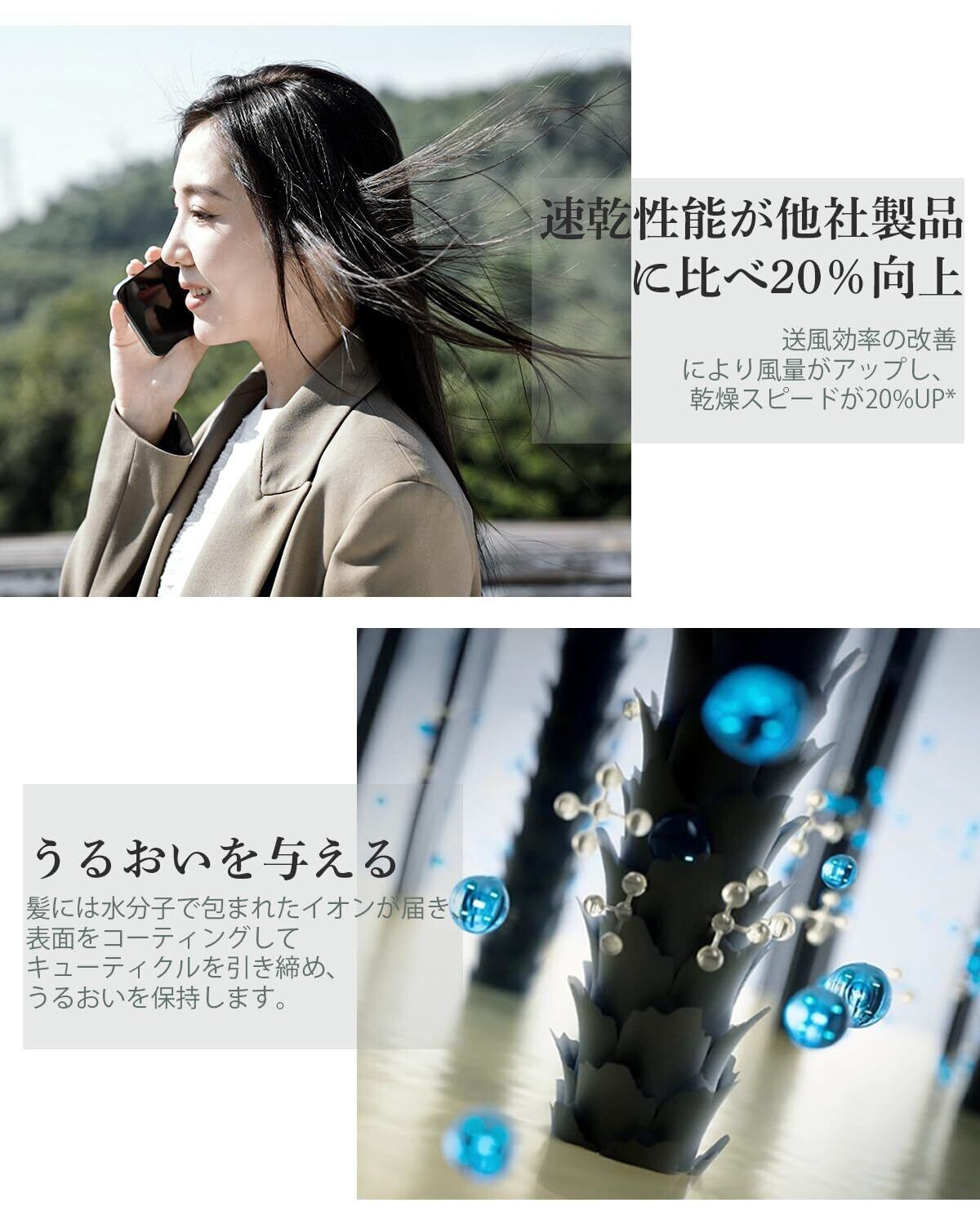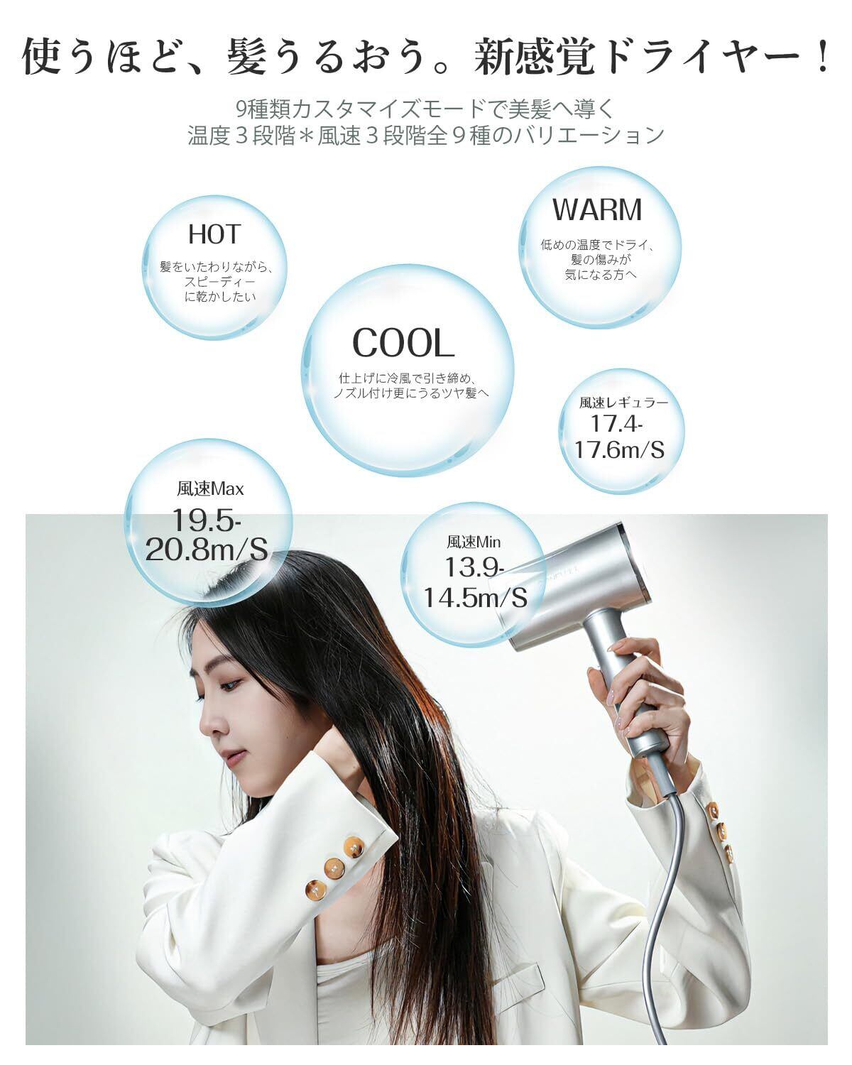 『ドライヤーでただ乾かすだけ。感動の絹つや髪へ。美容ドライヤー、誕生。』大風量と新型モーターの力て、「うるツヤ速乾」を叶えるTOPZEEのヘアドライヤー。毎日のドライ時間に取り入れるだけで、まとまりやすく、スタイリングしやすい美髪へと導きます。非常にパワフルな風なので、ロングヘアの方でも速乾が実現。退色を抑えるので、カラーリングを楽しんでいる方にもピックリです。110,000RMP*強力な気流を提供して、コントロールされた高圧の空気を生成するため、過度な熱によるダメージを防ぎながら、風の力で精度の高いスタイリングを実現することが可能です。忙しい日々に時短を叶える大風量高浸透ナノイー(2億マイナスイオン)を毛先まで届ける。高性能なのに軽量 & コンパクト。