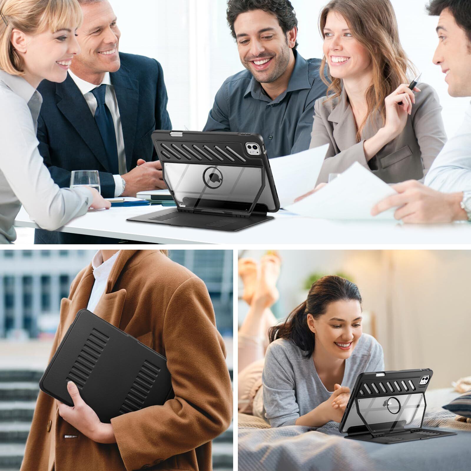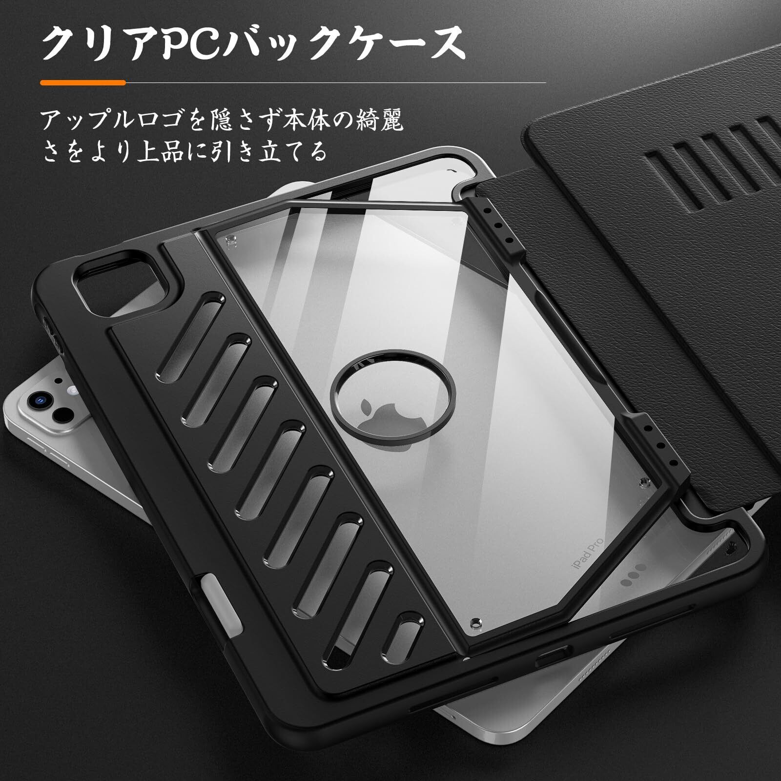 「360度全面保護」PCバック+TPU縁の二重構造よりiPad本体をしっかりと全方位で保護します。表面カバーは耐久性に優れた見栄えるPUレザーを採用しており、PCバックケースは透明仕様で、本体のアップルロゴを隠さずそのまま綺麗に現せます。