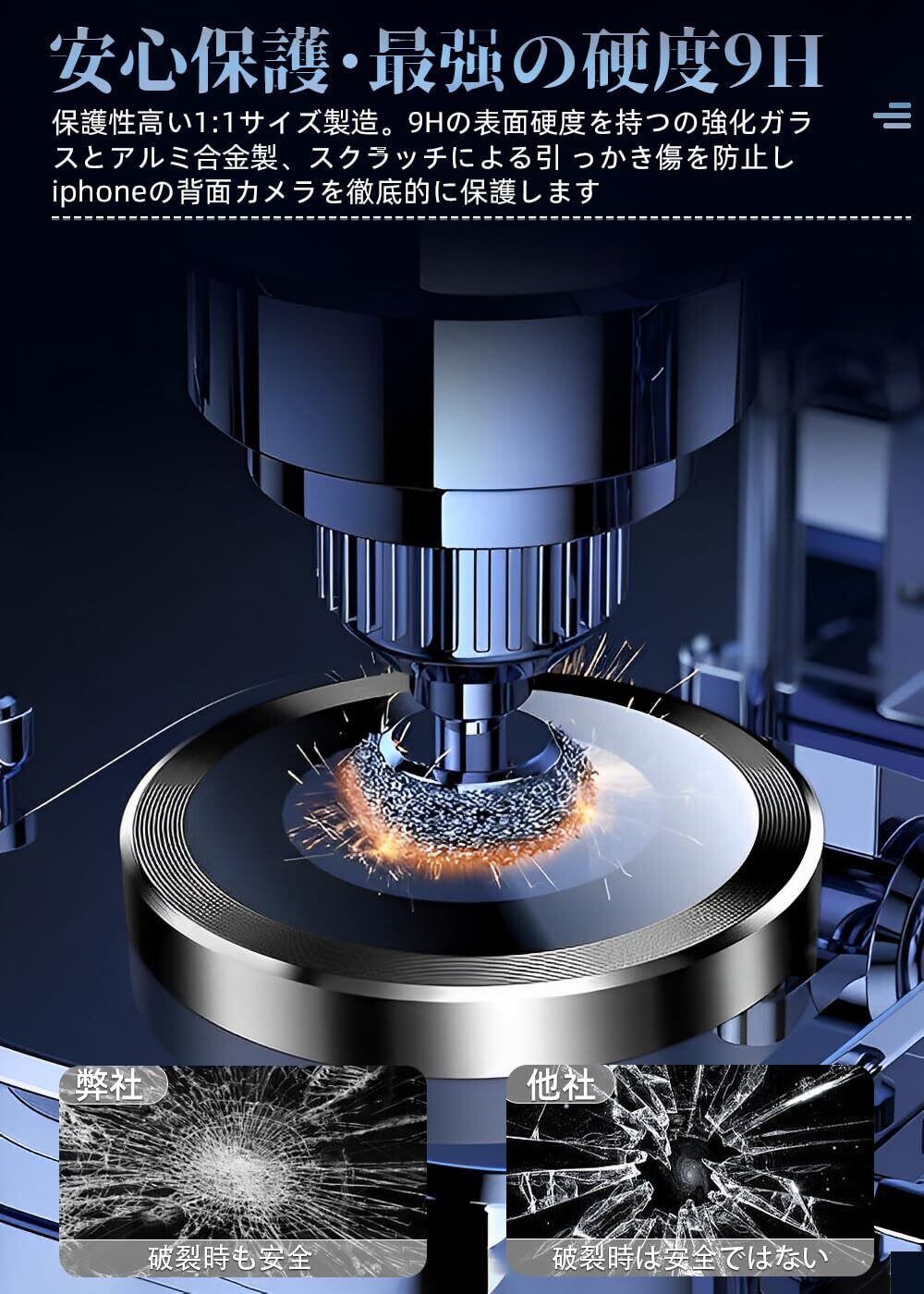 【耐衝撃性】巨大化になったカメラ、衝撃や接触からの破損のリスクも上がり、カメラ保護はもはや必須!カメラカバーはギャラクシーと同じガラス、また航空機用アルミ合金を採用、耐衝撃性が普通製品より20倍高く、盛り上がったレンズを角や落下への衝撃からしっかりと保護。更に、表面にレ一ザ焼入れ技術を採用、優れた硬化層を形成、ダイヤモンドに匹敵する硬度を実現、鍵などの鋭利な物による擦り傷から守れる。