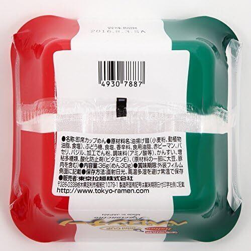 ●原材料名:油揚げ麺(小麦粉、動植物油脂、食塩)、ぶどう糖、食塩、香辛料、食用油脂、赤ピーマン、パセリ、バジル、加工でん粉、調味料(アミノ酸等)、かんすい、増粘多糖類、酸化防止剤(ビタミンE)、(原材料の一部に大豆、豚肉を含む)