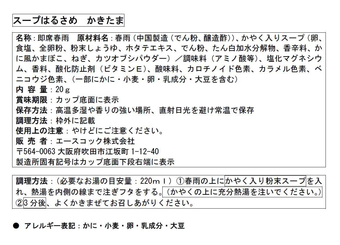 原材料名:春雨(中国製造(でん粉、醸造酢))、かやく入りスープ(卵、食塩、全卵粉、粉末しょうゆ、ホタテエキス、でん粉、たん白加水分解物、香辛料、かに風かまぼこ、ねぎ、カツオブシパウダー)/調味料(アミノ酸等)、塩化マグネシウム、香料、酸化防止剤(ビタミンE)、酸味料、カロチノイド色素、カラメル色素、紅麹色素、(一部にかに・小麦・卵・乳成分・大豆を含む)