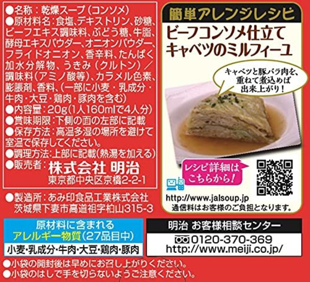 原材料:食塩、デキストリン、砂糖、ぶどう糖、ビーフエキス、牛 脂、粉末しょうゆ、酵母エキス、たんぱく加水分解物、オ ニオンパウダー、ビーフパウダー、香辛料、植物油脂、乳 糖、でん粉、ポークエキス、調味料(アミノ酸等)、カラ メル色素、香料、酸味料、うきみ(クルトン、膨張剤)、 (原材料の一部に小麦を含む)