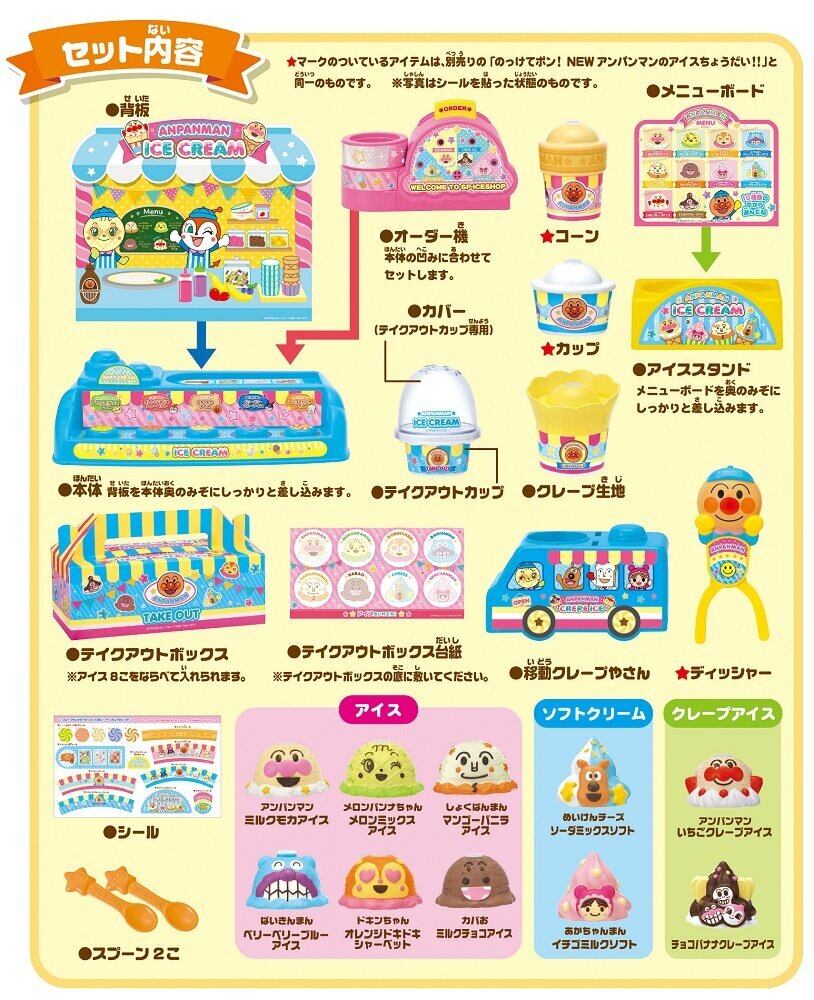 アンパンマンのアイスちょうだいのスペシャルバージョンは、くるくる回転する楽しいオーダー機と、移動クレープ屋さんが入っているよ。