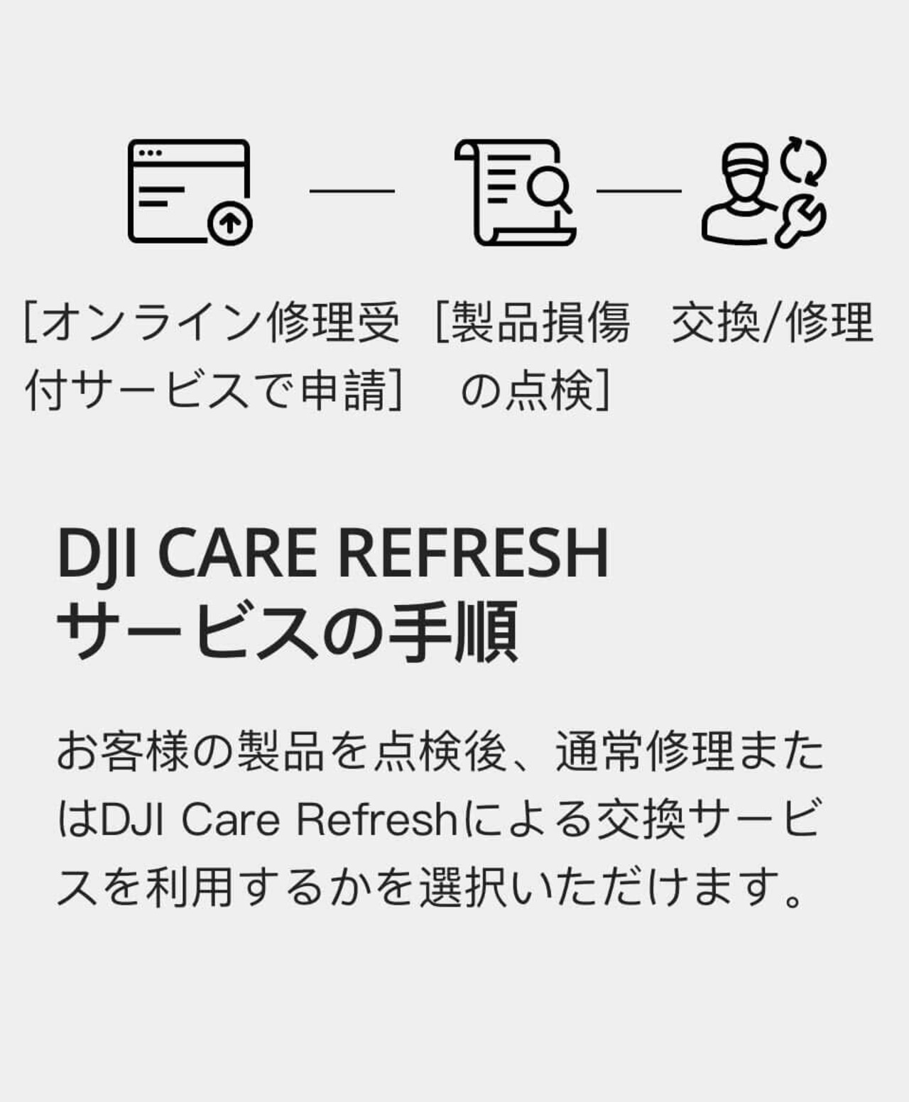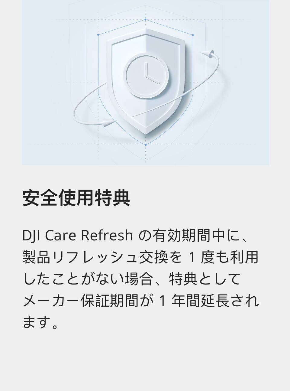 【商品説明】:DJI Care Refreshでは、1年間の有効期間内に少額の追加料金をお支払いいただくことで、2回までのリフレッシュ交換サービスを受けることができ、水没や墜落などの幅広い故障シーンに対応しています。その他、グローバル、専用テクニカルサポート、送料無料などのサービス特典も含まれています。さらに、DJI Care Refreshの有効期間中に、製品リフレッシュ交換を1度も利用したことがない場合、特典としてメーカー期間が1年間延長されます。