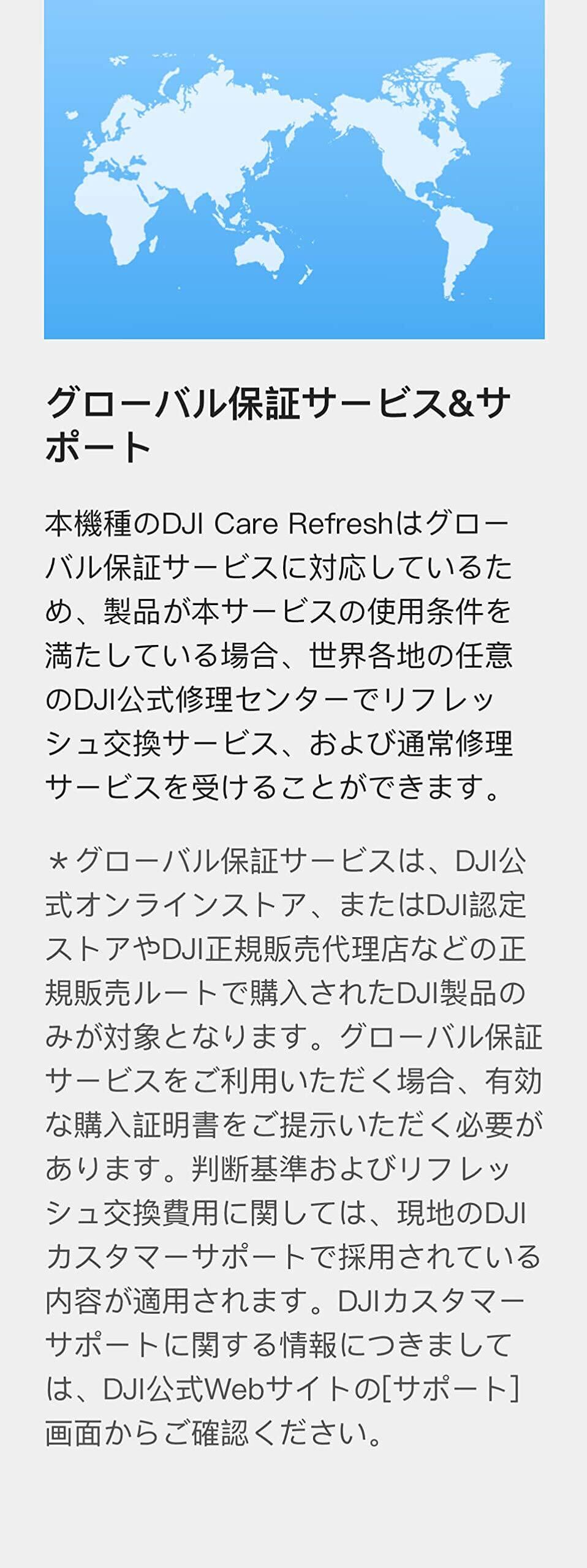 【グローバルサービス】:本製品グローバルサービスの使用条件を満たしている場合、世界各地の任意のDJI公式修理センターでリフレッシュ交換サービス、および通常修理サービスを受けることができます。