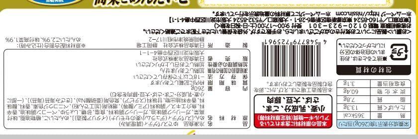 めん〔スパゲティ(デュラム小麦のセモリナ)(イタリア製造)〕、めんたいこ、植物油脂、味付高菜、ガーリック調味油、ガーリック調味料、食塩、砂糖、しょうゆ、ベーコン調味油、香辛料、魚介エキス/調味料(アミノ酸等)、増粘剤(加工でん粉)、ベニコウジ色素、香料、酸味料、香辛料抽出物、甘味料(ステビア)、発色剤(亜硝酸Na)、〔きざみ海苔(海苔)〕、(一部に小麦・乳成分・ごま・さば・大豆・豚肉を含む)