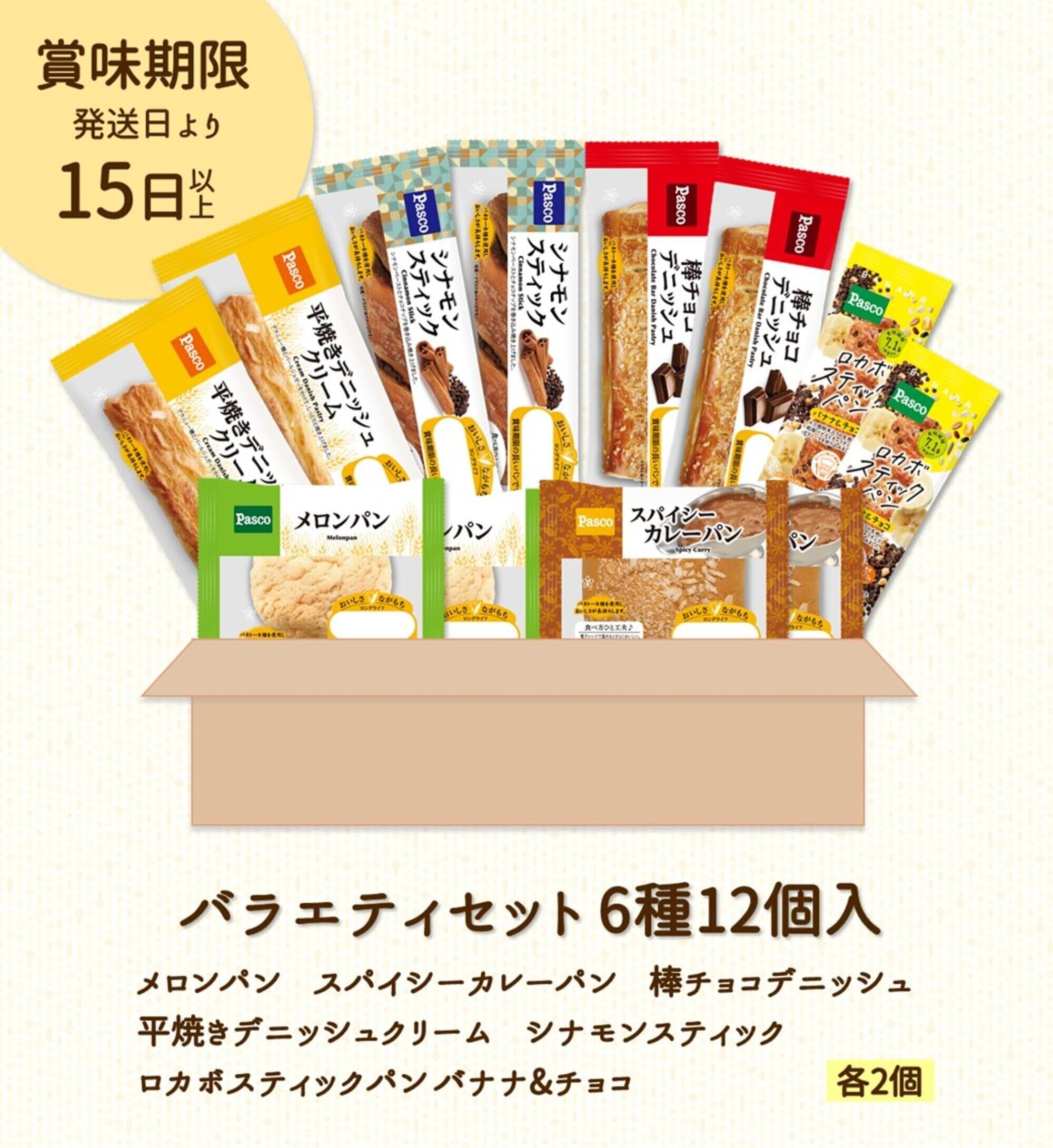 商品名を変更しました【旧】Pasco ロングライフアソートC 6種12個入→【新】Pasco 日持ち長持ち バラエティセット 6種12個入 ※在庫管理の都合上、旧品名が記載されている商品をお届けする場合がございます。商品の内容は全く同じですので、ご了承ください。