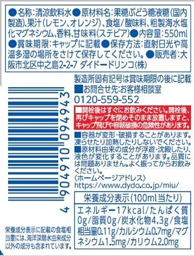果糖ぶどう糖液糖(国内製造)、果汁(レモン、オレンジ)、食塩/酸味料、粗製海水塩化マグネシウム、香料、甘味料(ステビア)