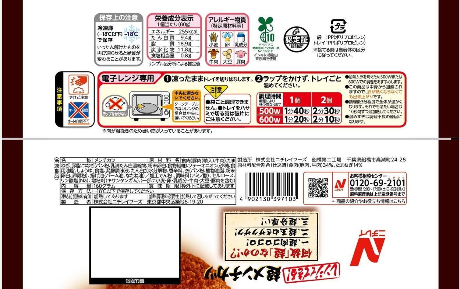 食肉(豚肉(輸入)、牛肉)、たまねぎ、豚脂、つなぎ(パン粉、乳清たん白濃縮物、粉末卵白、食物繊維)、ソテーオニオン、砂糖、食用油脂、しょうゆ、食塩、発酵調味液、たん白加水分解物、香辛料、衣(パン粉、植物油脂、粉末卵白、卵殻粉)、揚げ油(パーム油、なたね油)/加工でん粉、調味料(アミノ酸)、セルロース、リン酸塩(Na)、増粘剤(キサンタンガム)、(一部に小麦・卵・乳成分・牛肉・大豆・豚肉を含む)