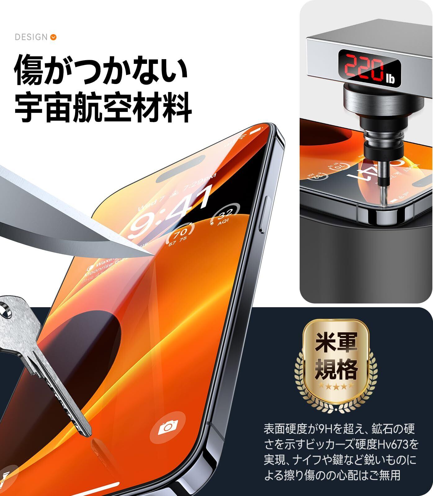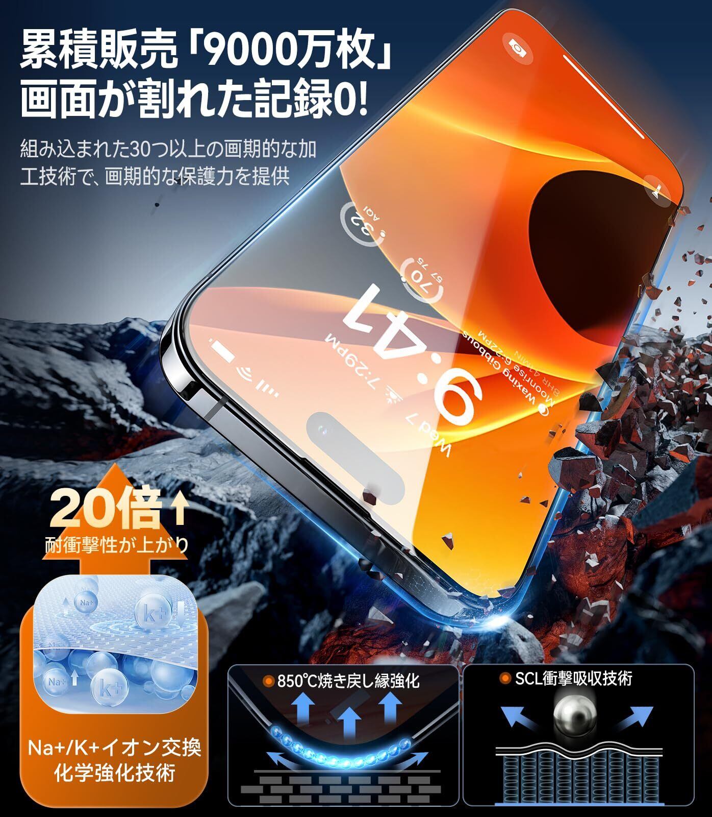 【米軍規格超え・衝撃から守れ】組み込まれたNa+/K+イオン交換、SCL緩衝層などの30つ以上の革命的な加工技術で、表面に圧縮応力層を発生させ、耐衝撃性が普通製品より20倍も高いです。更に、伝わる衝撃力を瞬時に分散させ、アイフォン15Proの液晶画面に正面からの衝撃による割れを徹底的に防ぐ、本当にスクリーン保護と絶対的な安心感を与えます。※米軍「MIL-STD-810G」規格認証番号:GZMR220300626209|認証機関:CSTC Standards Testing Center|Mar 28, 2022