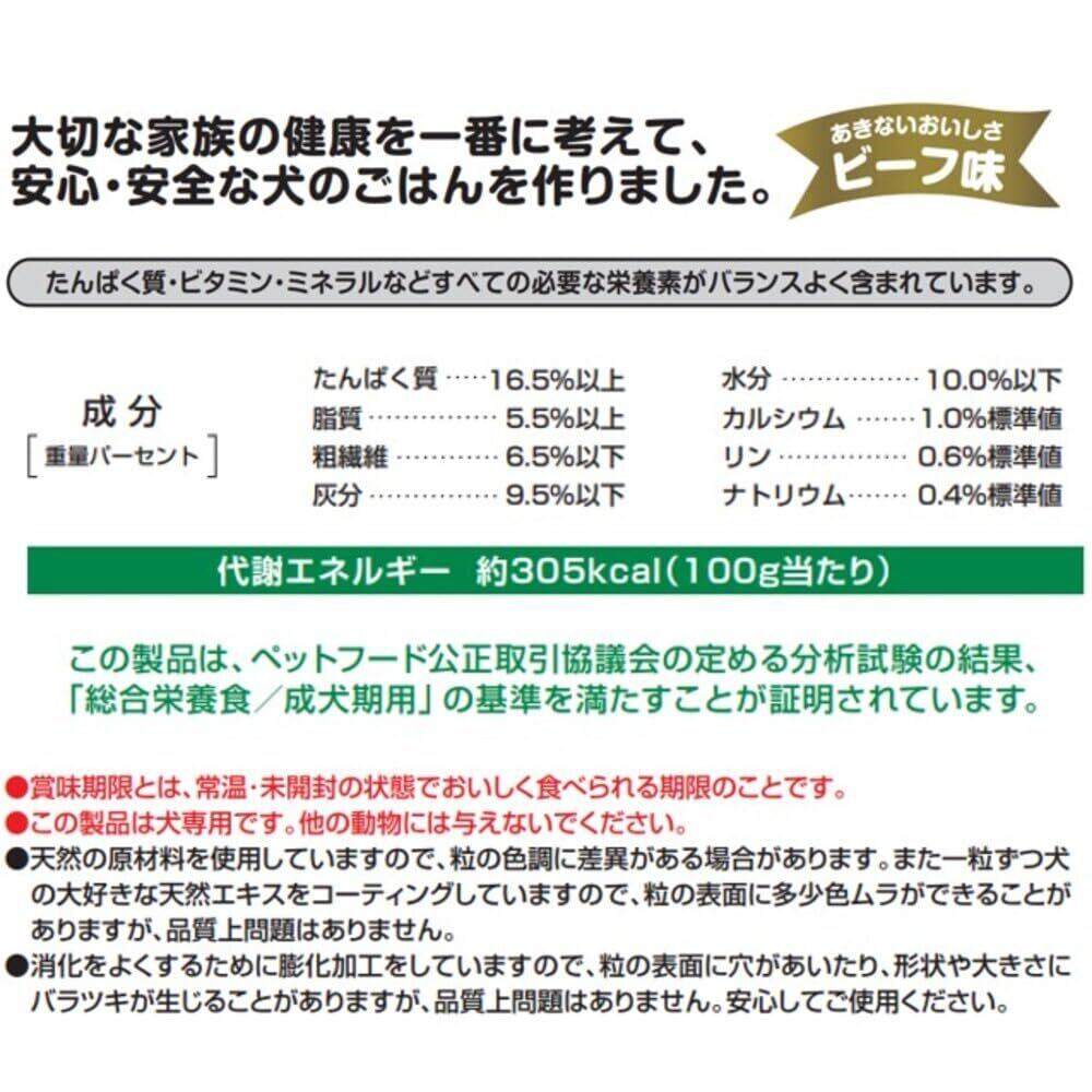 たんぱく質やビタミン、ミネラル類など、愛犬に必要な全ての栄養素をバランス良く摂れる総合栄養食。愛犬が大好きなビーフ味。健康を第一に考えた国産のおいしい「犬ごはん」。