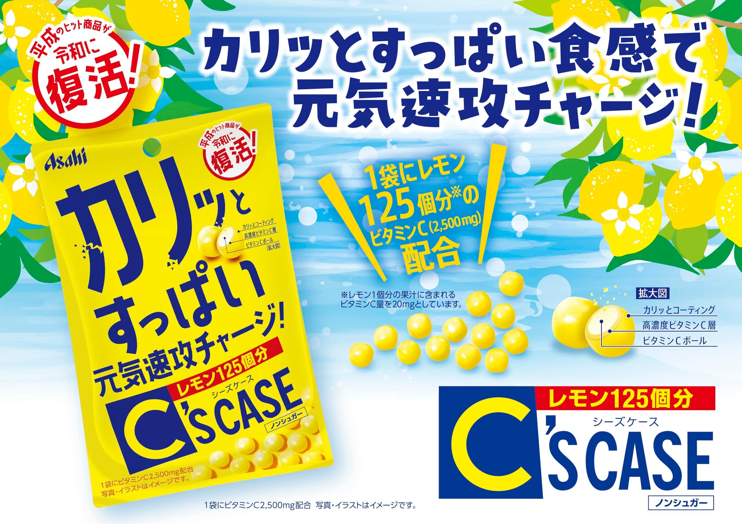 ●カリッと食感と強い酸味のある味わい。●1袋にレモン125個分のビタミンC(2,500mg)配合。●ビタミンCボール×高濃度ビタミンC層×カリッとコーティングの多層構造。●ノンシュガー。●パッケージにはシーズケースのイメージカラーである黄色を全面に使用し、商品特長である「カリッとすっぱい元気速効チャージ!」を大きく訴求することで、元気さ・楽しさを表現。●復活アイコンにより、喫食経験者・未経験者共にリバイバル商品であることを訴求。