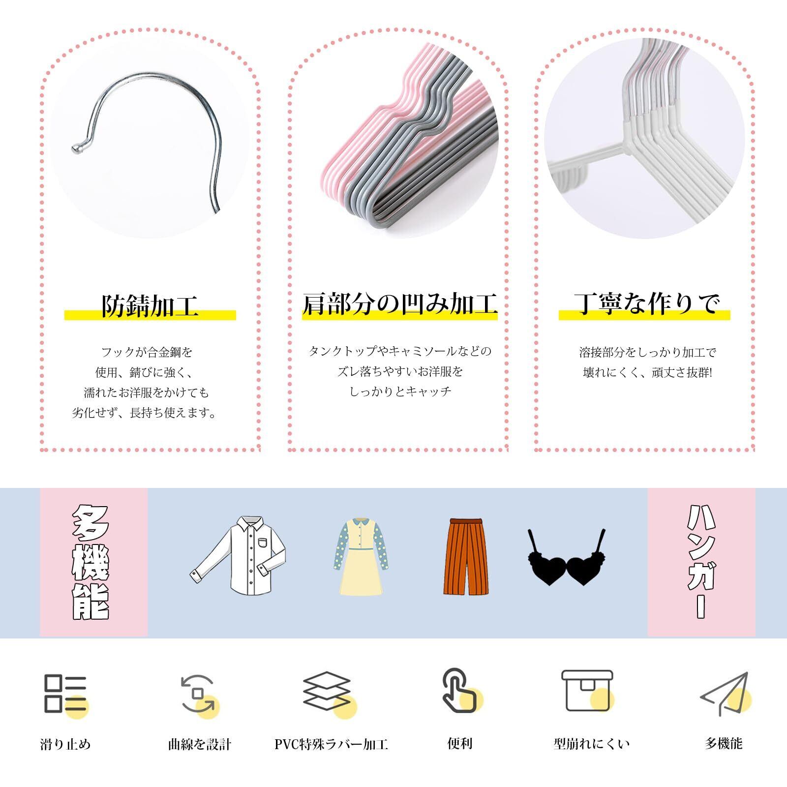 【高品質】高品質素材:合金鋼+PVC加工 サイズ:40cmx20cmx0.3cm、1本/約40g。フック部分は防錆加工、つなぎ目は特殊加工しているので耐久性と安全性がとても良いハンガーです。PVC加工で滑りにくいのに加えて、両肩部分にへこみがあってキャミソールなどもさらに落ちにくい仕様です。