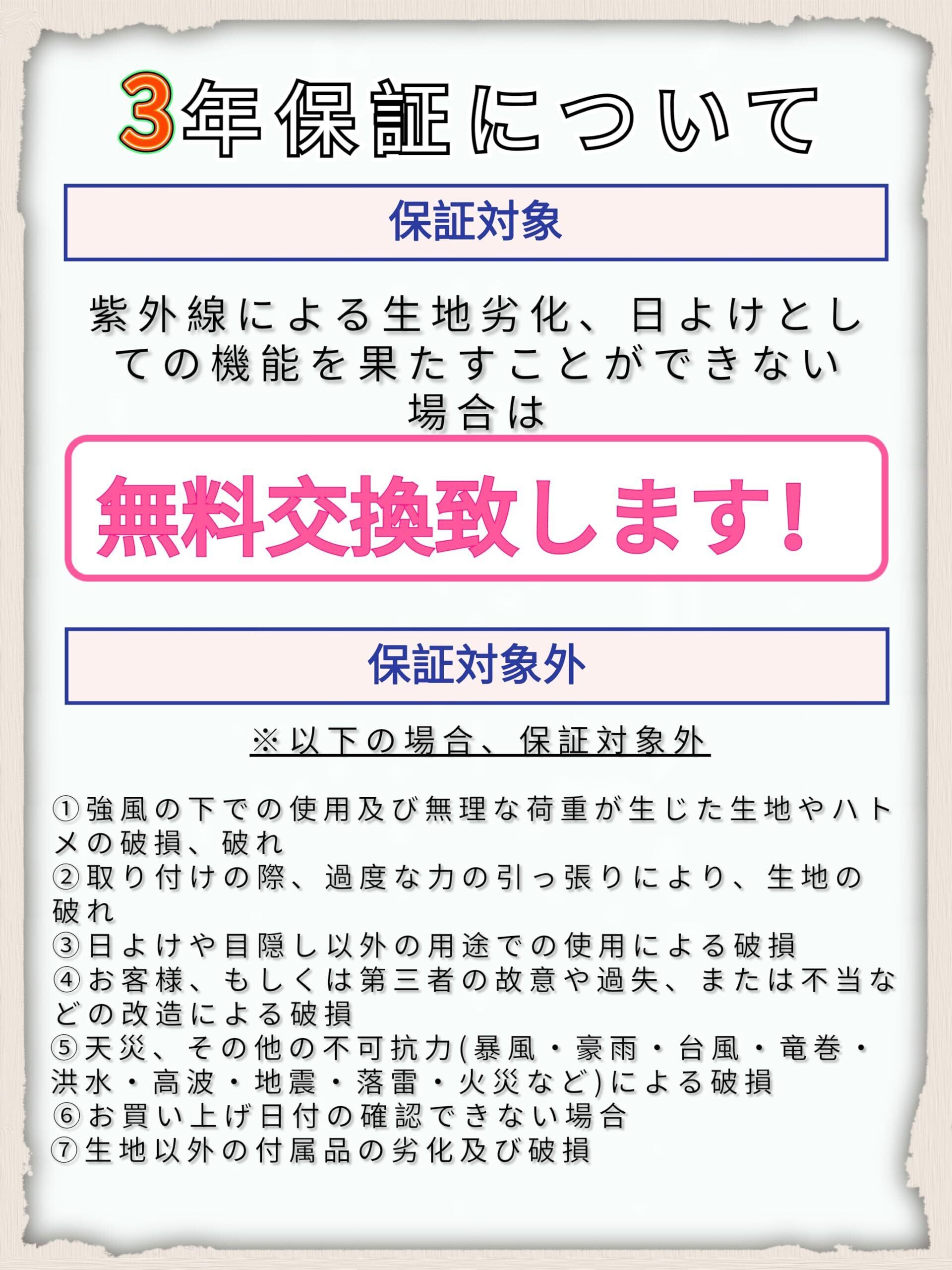 ●サビに強いアルミ製のハトメを採用し、約50㎝おきに1個のハトメ設置、シェードのたるみや風によるバタつきを防ぐ為に紐やフックを通せて便利です。