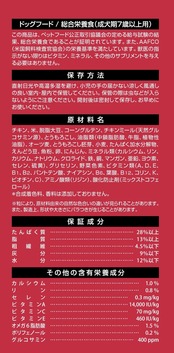 成分:たんぱく質:28%以上、脂質:13%以上、粗繊維:4.5%以下、灰分9%以下、水分12%以下