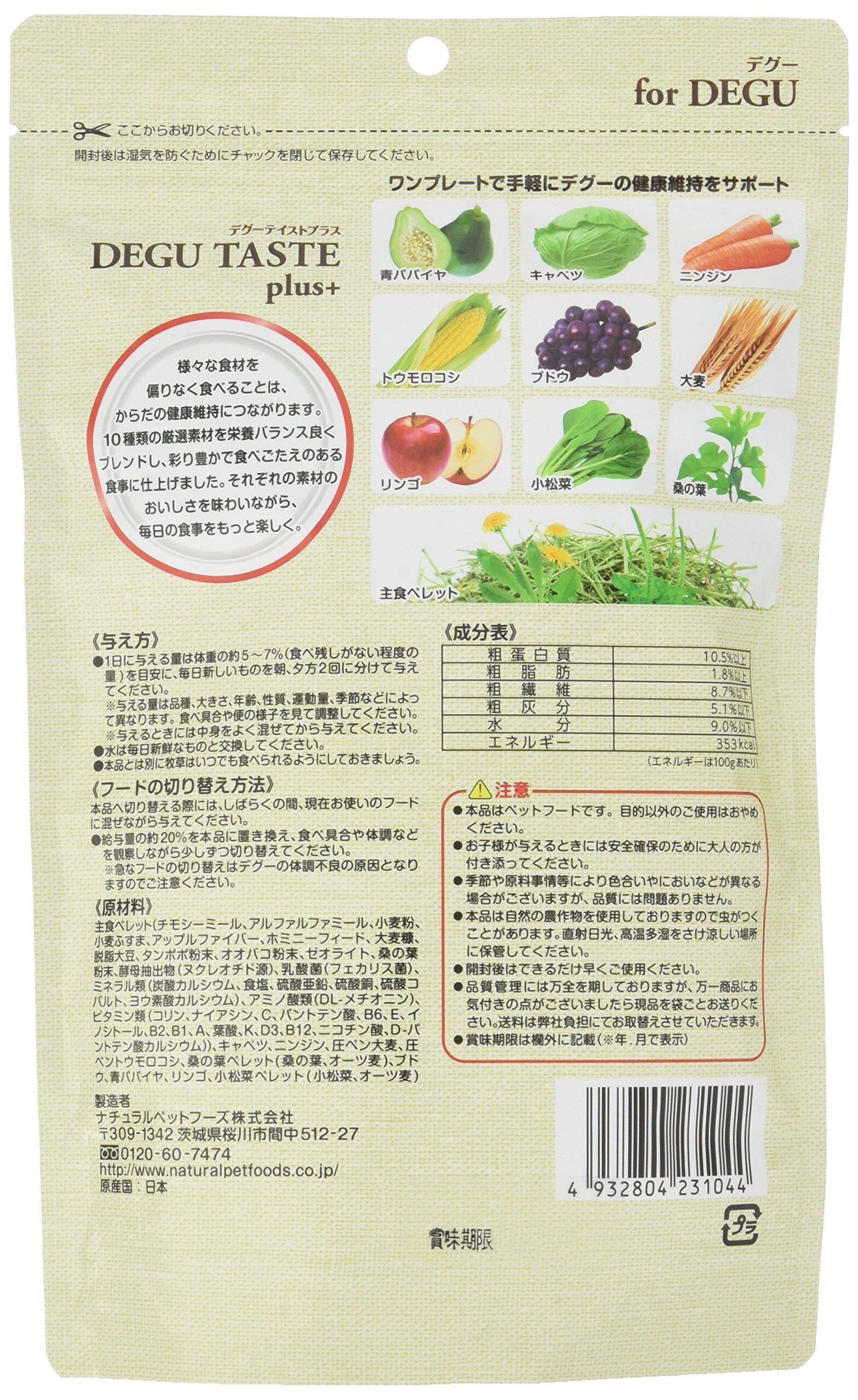 10種類の厳選素材をブレンド、ワンプレートで気軽にデグーの健康維持をサポートします。乳酸菌配合主食ペレットでおなかの健康をサポート。酵素を豊富に含む青パパイヤ入りで消化をサポート。天然素材、小松菜・桑の葉ペレット入りで手軽に栄養補給。