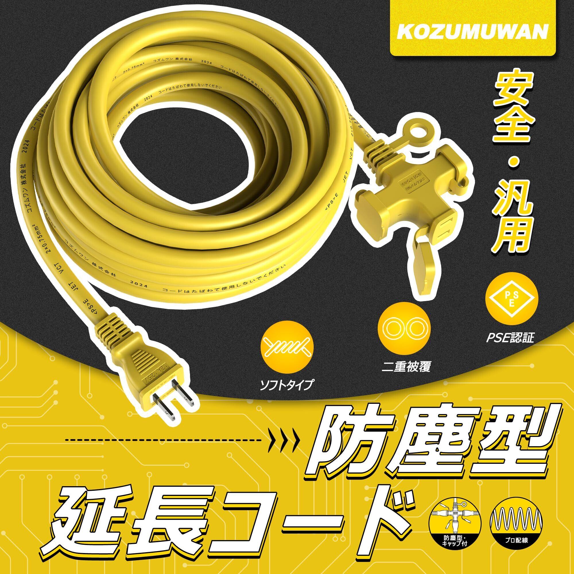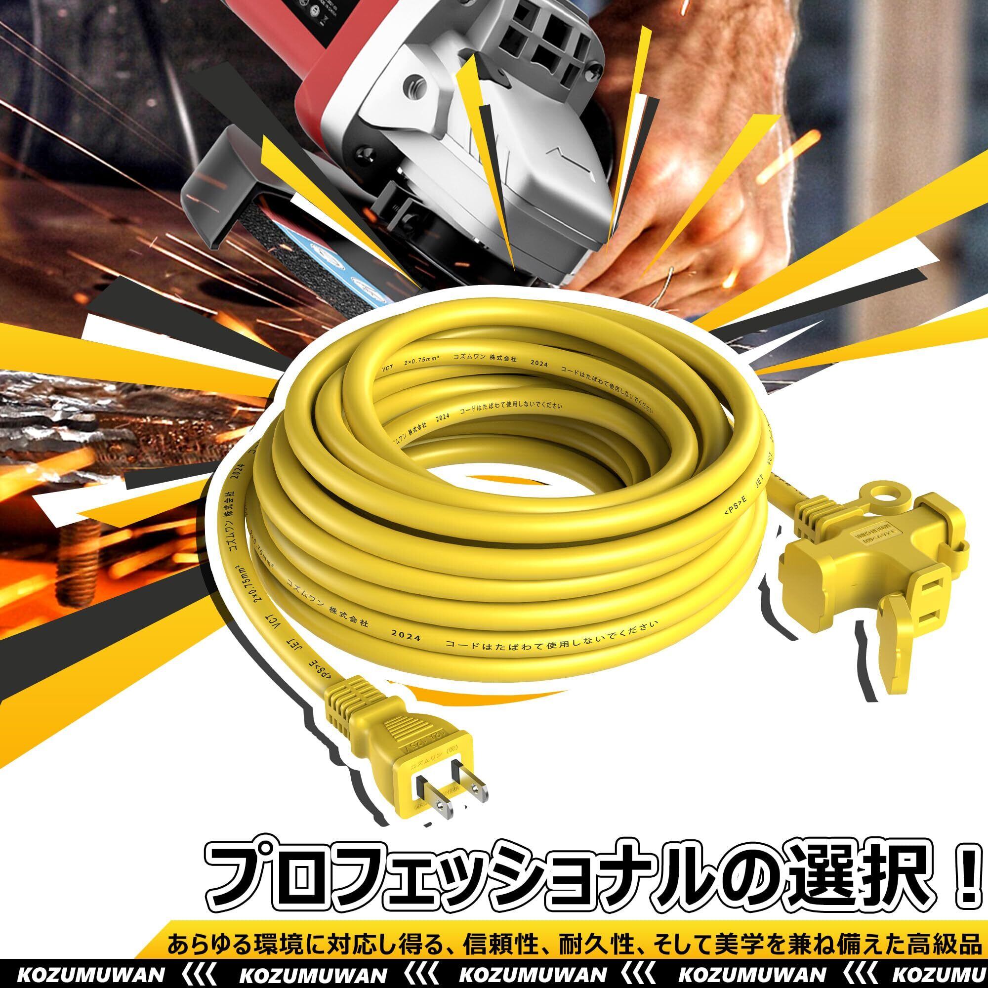 延長コード 10m 3個口 VCT高耐久 ソフトケーブル 125V 12A 耐トラッキングカバー付 イエロー 作業用 防塵キャップ付 電源ケーブル 10メートル 耐寒耐熱 汎用 耐久 電動工具 配線 工事現場 汎用機器 屋外室内 生活防水