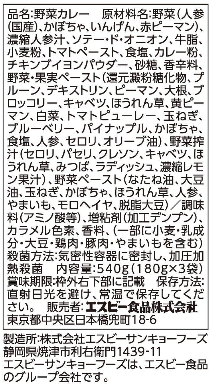 原材料:野菜(人参(国産)、かぼちゃ、いんげん、赤ピーマン)、濃縮人参汁、ソテー・ド・オニオン、牛脂、小麦粉、トマトペースト、食塩、カレー粉、チキンブイヨンパウダー、砂糖、香辛料、野菜・果実ペースト(還元澱粉糖化物、プルーン、デキストリン、ピーマン、大根、ブロッコリー、キャベツ、ほうれん草、黄ピーマン、白菜、トマトピューレー、玉ねぎ、ブルーベリー、パイナップル、かぼちゃ、食塩、人参、セロリ、オリーブ油)、野菜搾汁(セロリ、パセリ、クレソン、キャベツ、ほうれん草、みつば、ラディッシュ、濃縮レモン果汁)、野菜ペースト(なたね油、大豆油、玉ねぎ、かぼちゃ、ほうれん草、人参、やまいも、モロヘイヤ、脱脂大豆)/調味料(アミノ酸等)、増粘剤(加工デンプン)、カラメル色素、香料、(一部に小麦・乳成分・大豆・鶏肉・豚肉・やまいもを含む)