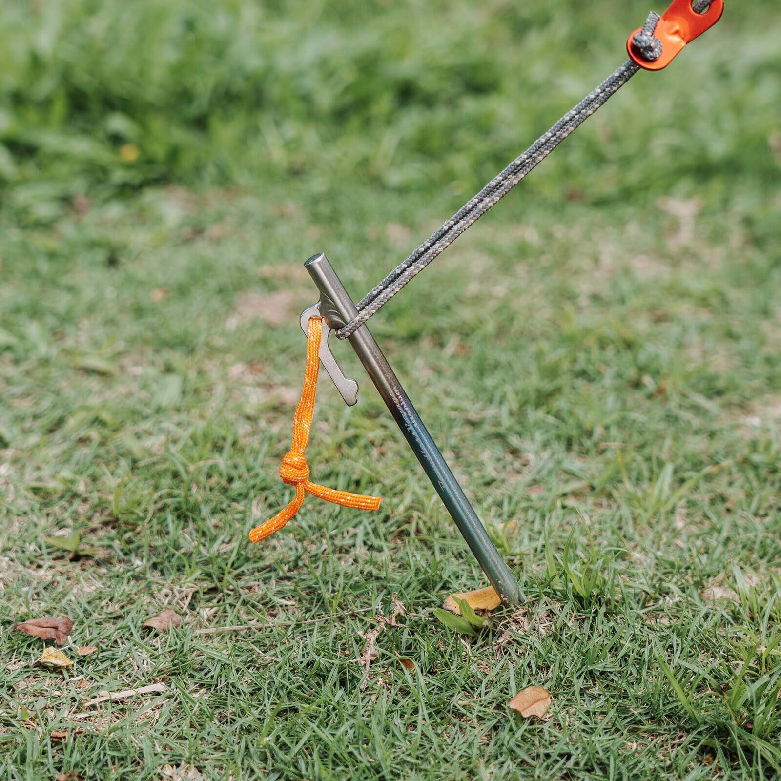 【反射材ロープ付き】オレンジ色のロープには反射材料が織り込まれ、夜中で撤収する時、ちよっとした光があれば、すぐペグの位置を確認し、回収が簡単になります。