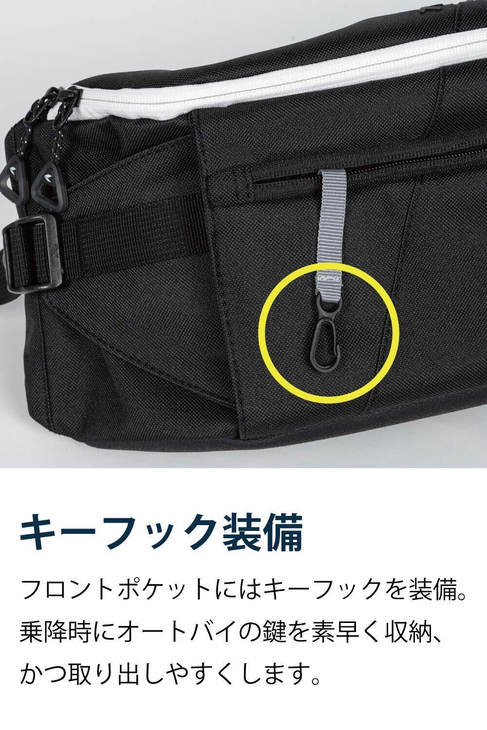 【 キーフック装備 】 フロントポケットにはキーフックを装備。乗降時にオートバイの鍵を素早く収納、かつ取り出しやすくします。