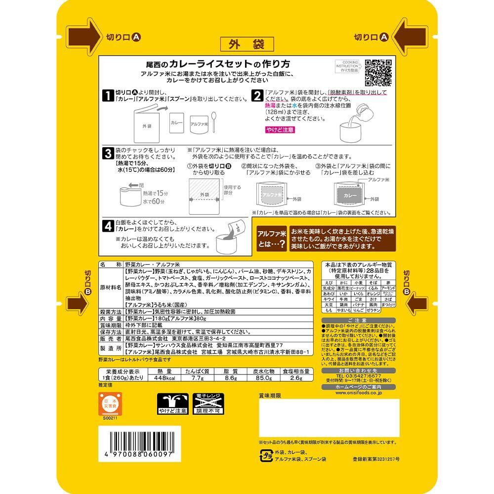 【野菜カレー】野菜(玉ねぎ、じゃがいも、にんじん)、パーム油、砂糖、デキストリン、カレーパウダー、トマトペースト、食塩、ガーリックペースト、ローストココナッツペースト、酵母エキス、かつおぶしエキス、香辛料/増粘剤(加工デンプン、キサンタンガム)、調味料(アミノ酸等)、カラメル色素、乳化剤、酸化防止剤(ビタミンC)、香料、香辛料抽出物【アルファ米】うるち米(国産)