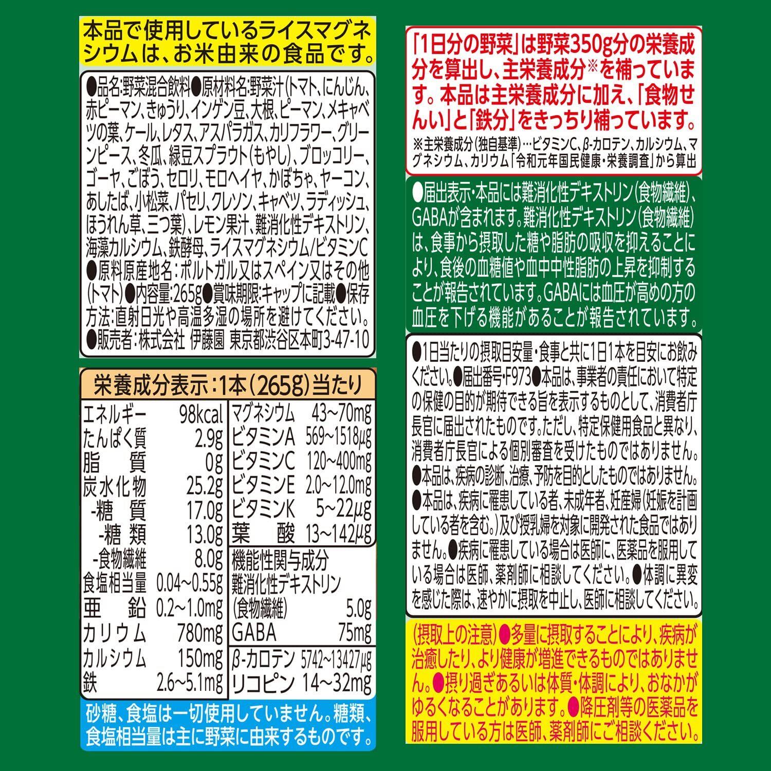 栄養成分(1本(265g)当たり):エネルギー 98kcal、たんぱく質 2.9g、脂質 0g、炭水化物 25.2g(糖質 17.0g、食物繊維 8.0g)、食塩相当量 0.04~0.55g、亜鉛 0.2~1.0mg、カリウム 780mg、カルシウム 150mg、鉄 2.6~5.1mg、マグネシウム 43~70mg、ビタミンA 569~1518μg、ビタミンC 120~400mg、ビタミンE 2.0~12.0mg、ビタミンK 5~22μg、葉酸 13~142μg 機能性関与成分 難消化デキストリン(食物繊維) 5.0g、GABA 75mg、β-カロテン 5742~13427μg、リコピン 14~32mg 砂糖、食塩は一切使用していません。糖類、食塩相当量は主に野菜に由来するものです。