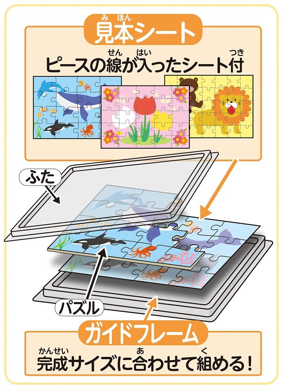 付属の見本シートとガイドフレームを使って、未就学児でもひとりでパズルを完成させることができます。 幼児向けパズルの次のステップとして楽しめるジグソーパズルです。