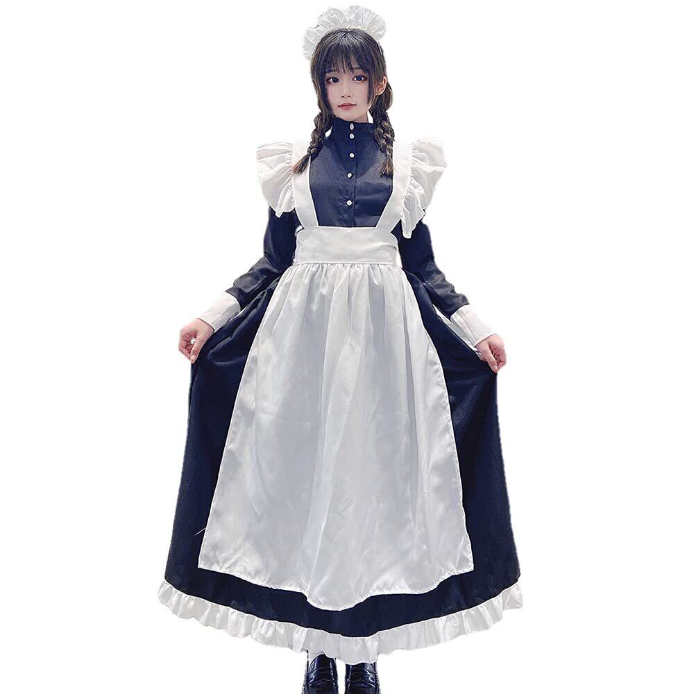YIUHK メイド服 英國風 ロング ロリータ コスプレ ハロウィン 仮装 レディース ワンピース エプロン イベント クラシカル 長袖 カチューシャ ニーハイソックス付き 4点セット (L)