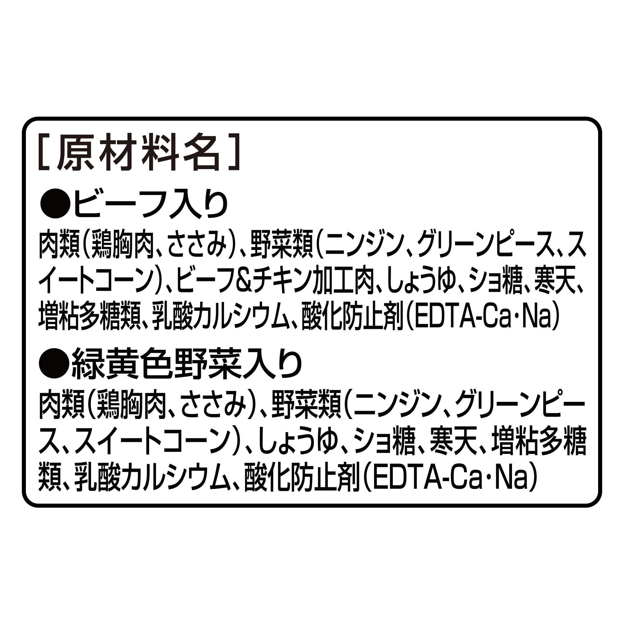 【原材料】 【ビーフ入り】 肉類(鶏胸肉、ささみ)、野菜類(ニンジン、グリーンピース、スイートコーン)、ビーフ&チキン加工肉、しょうゆ、ショ糖、寒天、増粘多糖類、乳酸カルシウム、酸化防止剤(EDTA-Ca・Na) 【緑黄色野菜入り】 肉類(鶏胸肉、ささみ)、野菜類(ニンジン、グリーンピース、スイートコーン)、しょうゆ、ショ糖、寒天、増粘多糖類、乳酸カルシウム、酸化防止剤(EDTA-Ca・Na) 【成分】 たんぱく質7.0%以上、脂質1.0%以上、粗繊維1.0%以下、灰分1.5%以下、水分90.0%以下 【エネルギー】 50kcal/1袋