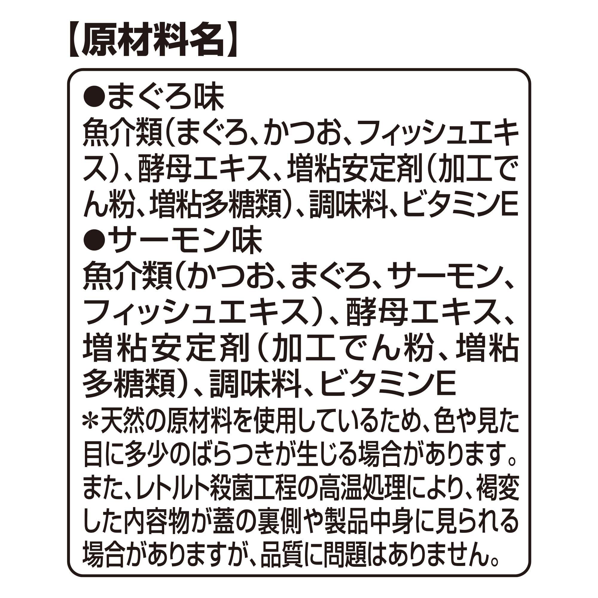 【原材料】 <まぐろ味> 魚介類(まぐろ、かつお、フィッシュエキス)、増粘安定剤(加工でん粉、増粘多糖類)、調味料、ビタミンE <サーモン味> 魚介類(かつお、まぐろ、サーモン、フィッシュエキス)、増粘安定剤(加工でん粉、増粘多糖類)、調味料、ビタミンE 【成分】 たんぱく質7.0%以上、脂質0.1%以上、粗繊維1.0%以下、灰分3.0%以下、水分90.0%以下 【エネルギー】 4kcal/1本