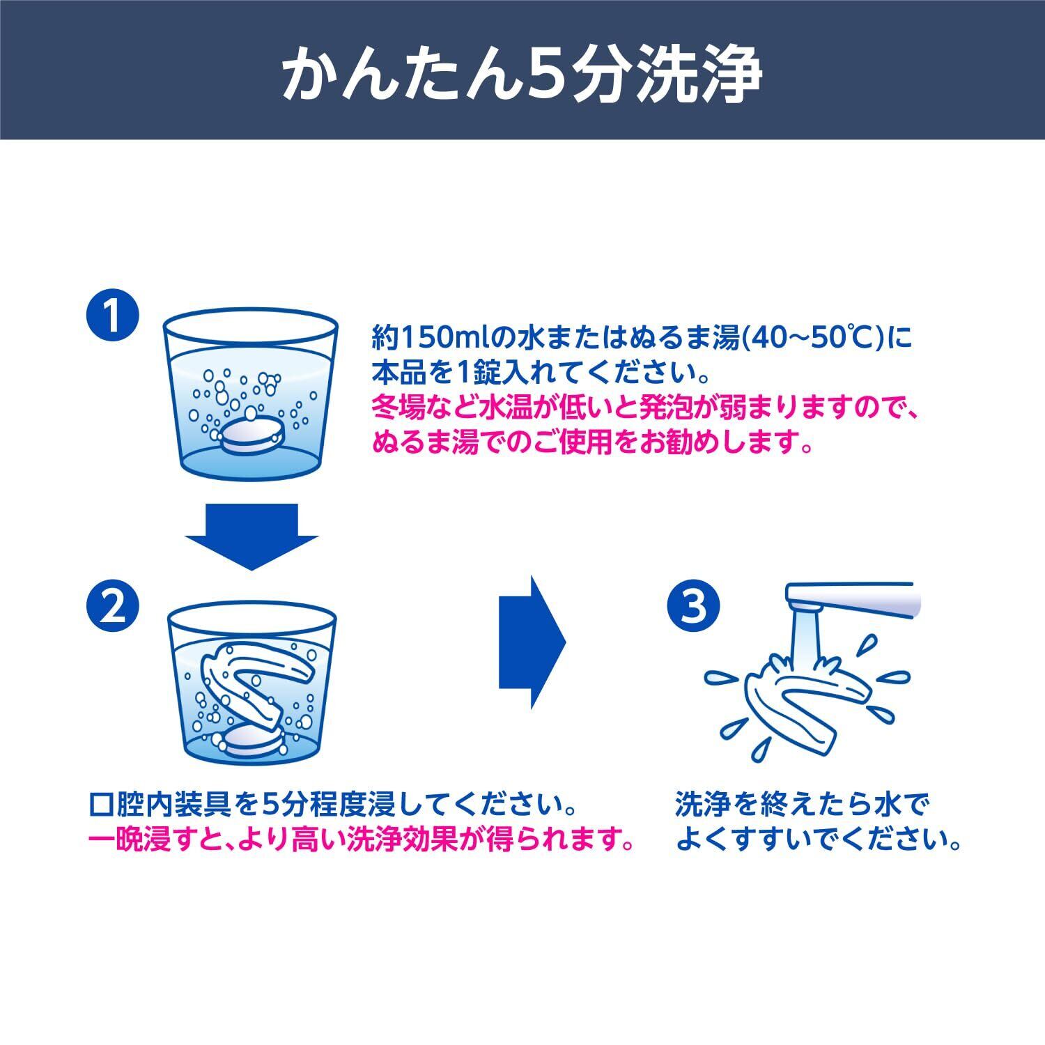 5分間でOK。うれしい短時間洗浄! 約150mlの水に本品を1錠入れ、口腔内装具を浸すだけでOK。一晩浸せば、より高い洗浄効果が得られます。 また、本品を毎日使用すれば、洗浄・除菌・消臭の効果がさらに増していきます。