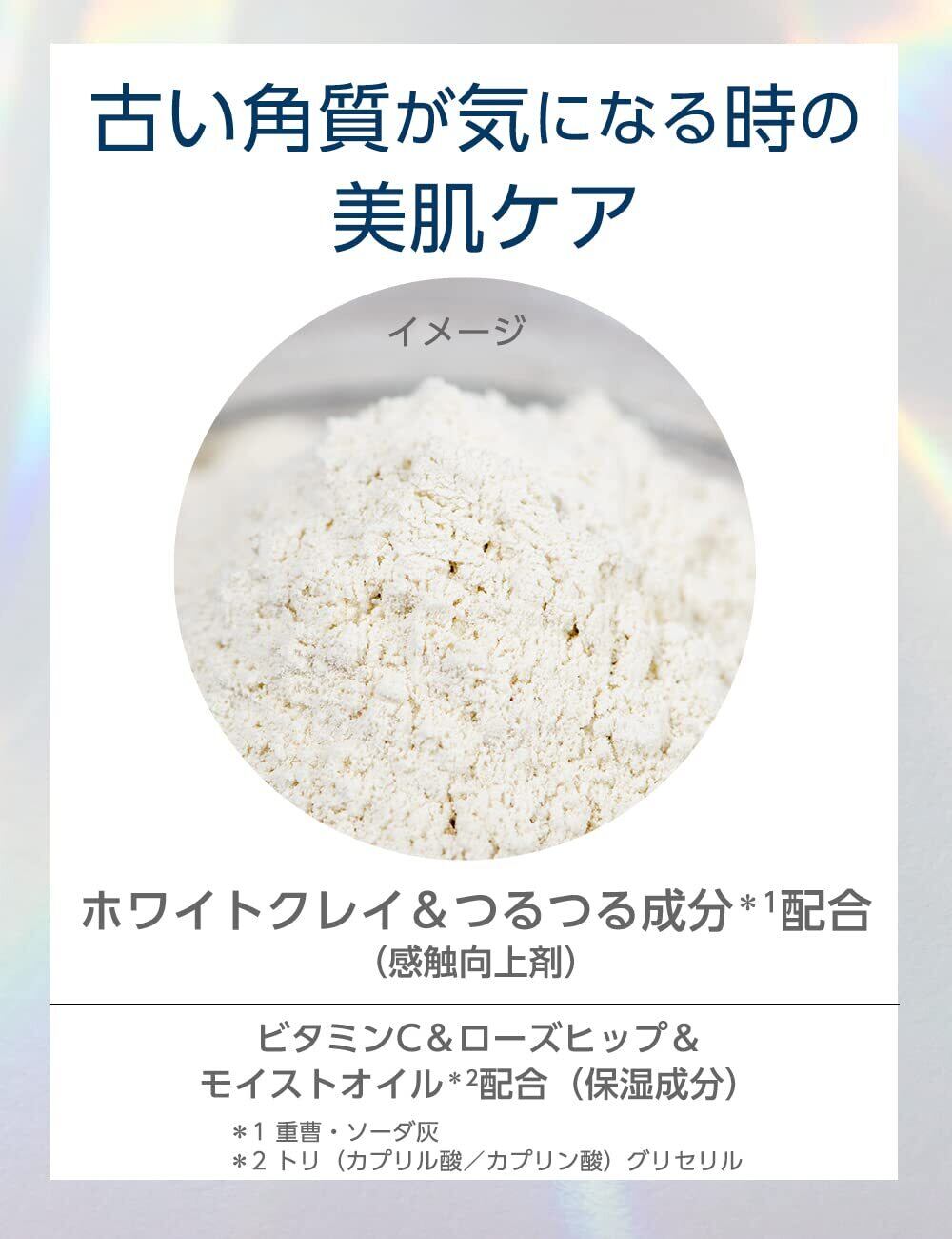 【成分】炭酸水素Na、炭酸Na、硫酸Na、香料、酸化チタン、タルク、ベントナイト、ケイ酸Ca、トリ(カプリル酸/カプリン酸)グリセリル、アスコルビン酸Na、カニナバラ果実エキス、コメ胚芽油、ハトムギ種子エキス、カラスムギ穀粒エキス、ヒドロキシエチルセルロース、酸化Mg、メタリン酸Na、テトラオレイン酸ソルベス-40、ステアレス-6、ポリアクリル酸Na、ポリアクリル酸、PVP、BG、水