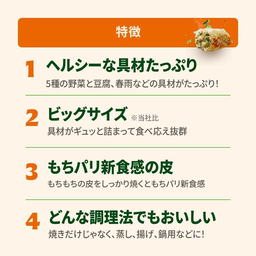 【原材料】 野菜(にら、キャベツ、たまねぎ、ねぎ、にんにく)、豚肉、豆腐、はるさめ、粒状大豆たん白、シーズニング、牛肉だしの素、砂糖、食塩、こしょう、生姜粉、皮(小麦粉、小麦グルテン、食塩、大豆油) / 加工でん粉、調味料(アミノ酸等)、酸味料、香料、(一部に小麦・乳成分・牛肉・大豆・豚肉を含む)