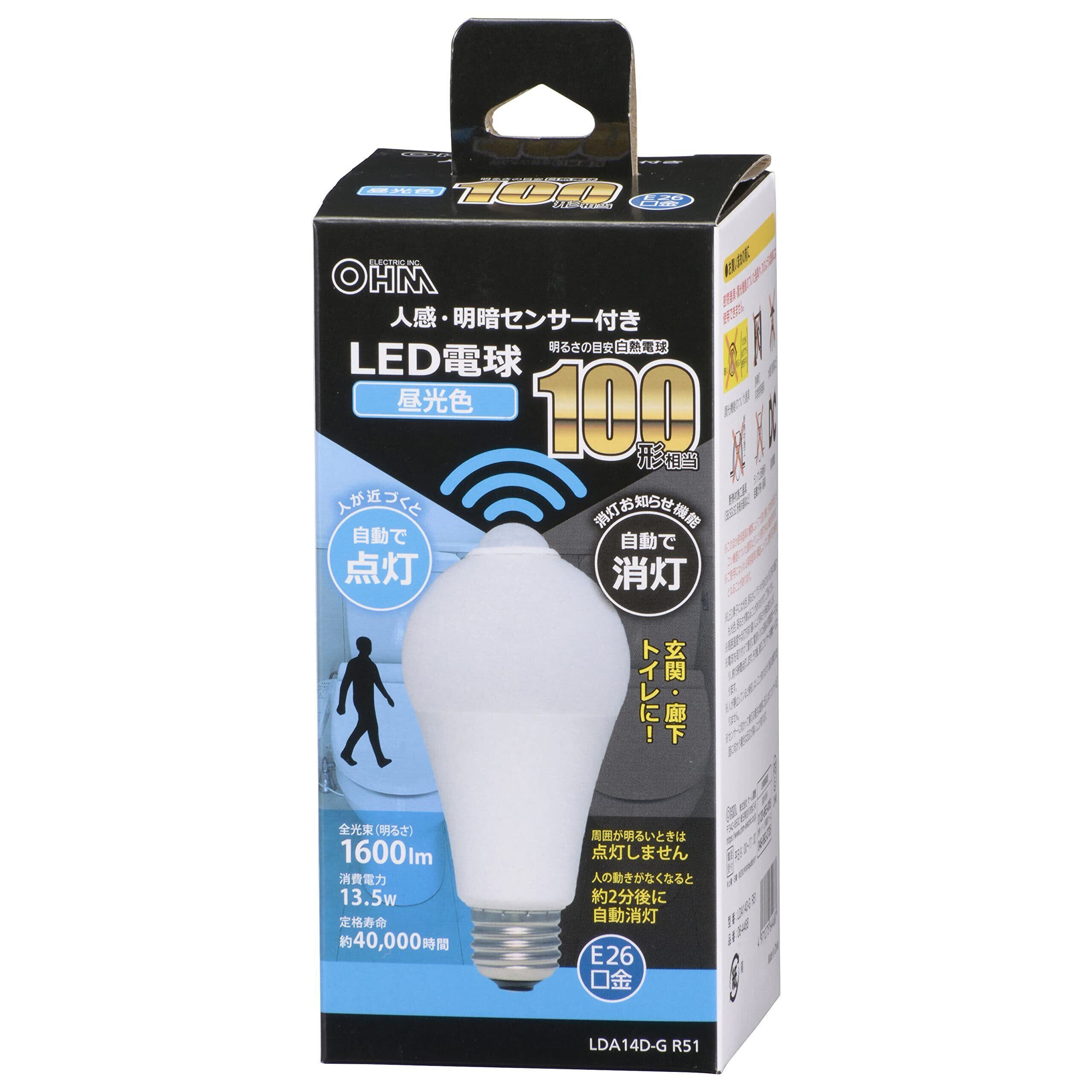 オーム(OHM) 電機 LED電球 E26 100形相当 人感明暗センサー付 昼光色 人感センサー 100ワット相当 自動点灯 玄関 トイレ 廊下 階段 LDA14D-G R51 06-4468