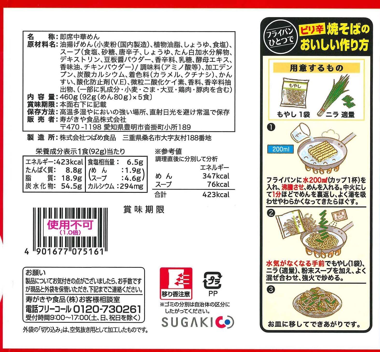 油揚げめん(小麦粉(国内製造)、植物油脂、しょうゆ、食塩)、スープ(食塩、砂糖、唐辛子、しょうゆ、たん白加水分解物、デキストリン、豆板醤パウダー、香辛料、乳糖、酵母エキス、香味油、チキンパウダー)/調味料(アミノ酸等)、加工デンプン、炭酸カルシウム、着色料(カラメル、クチナシ)、かんすい、酸化防止剤(V.E)、微粒二酸化ケイ素、香料、香辛料抽出物、(一部に乳成分・小麦・ごま・大豆・鶏肉・豚肉を含む)