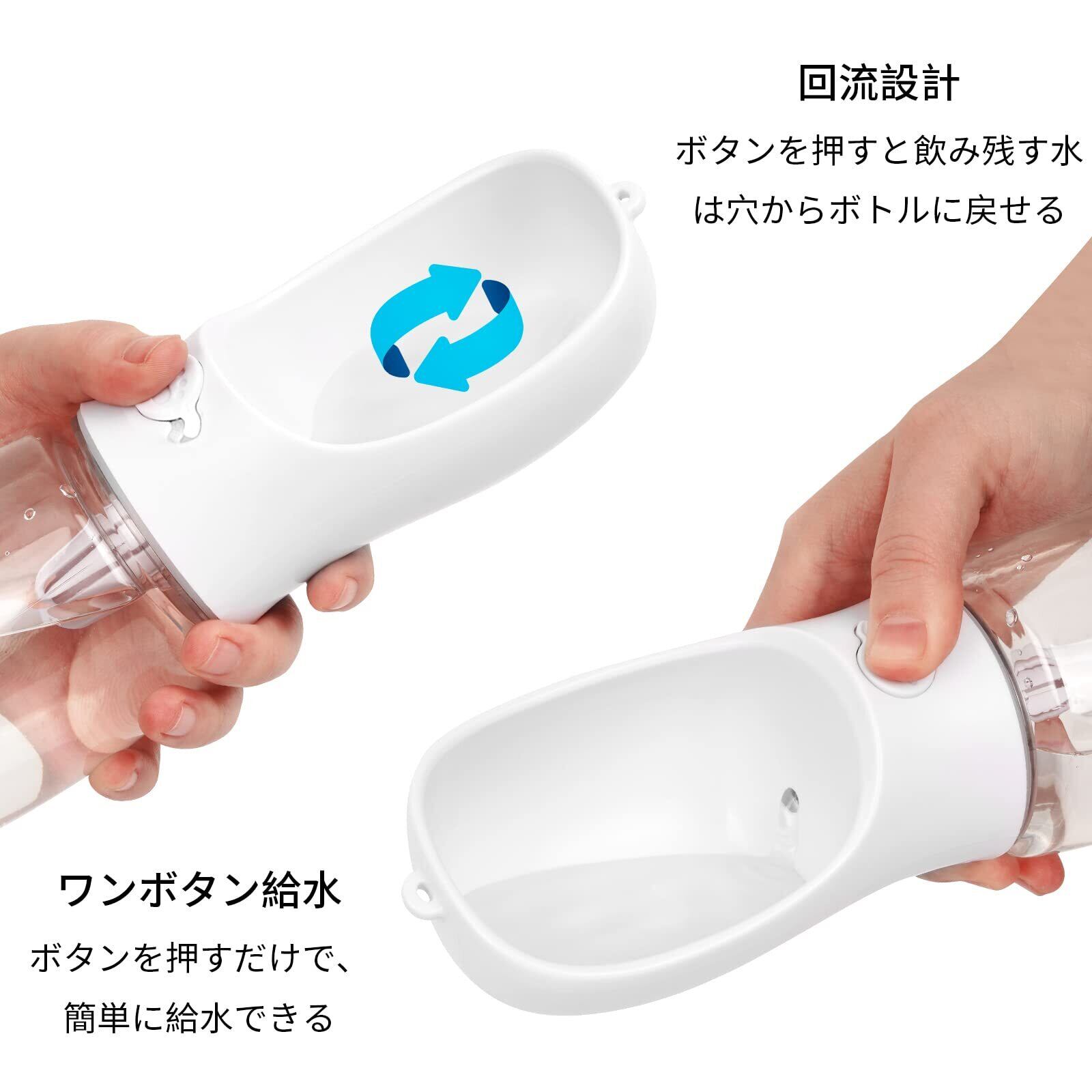 Bateruni ペットウォーターボトル 犬ウォーターボトル 携帯用 水漏れ防止 水槽付き 手軽に水分補給 水飲みボトル 犬 散歩 アウトドア用 水飲み器 (350ml、ホワイト)