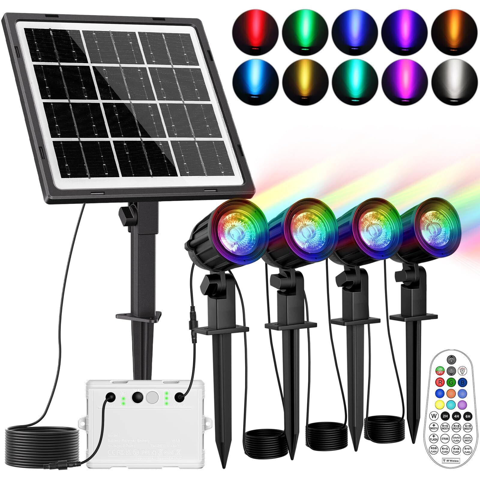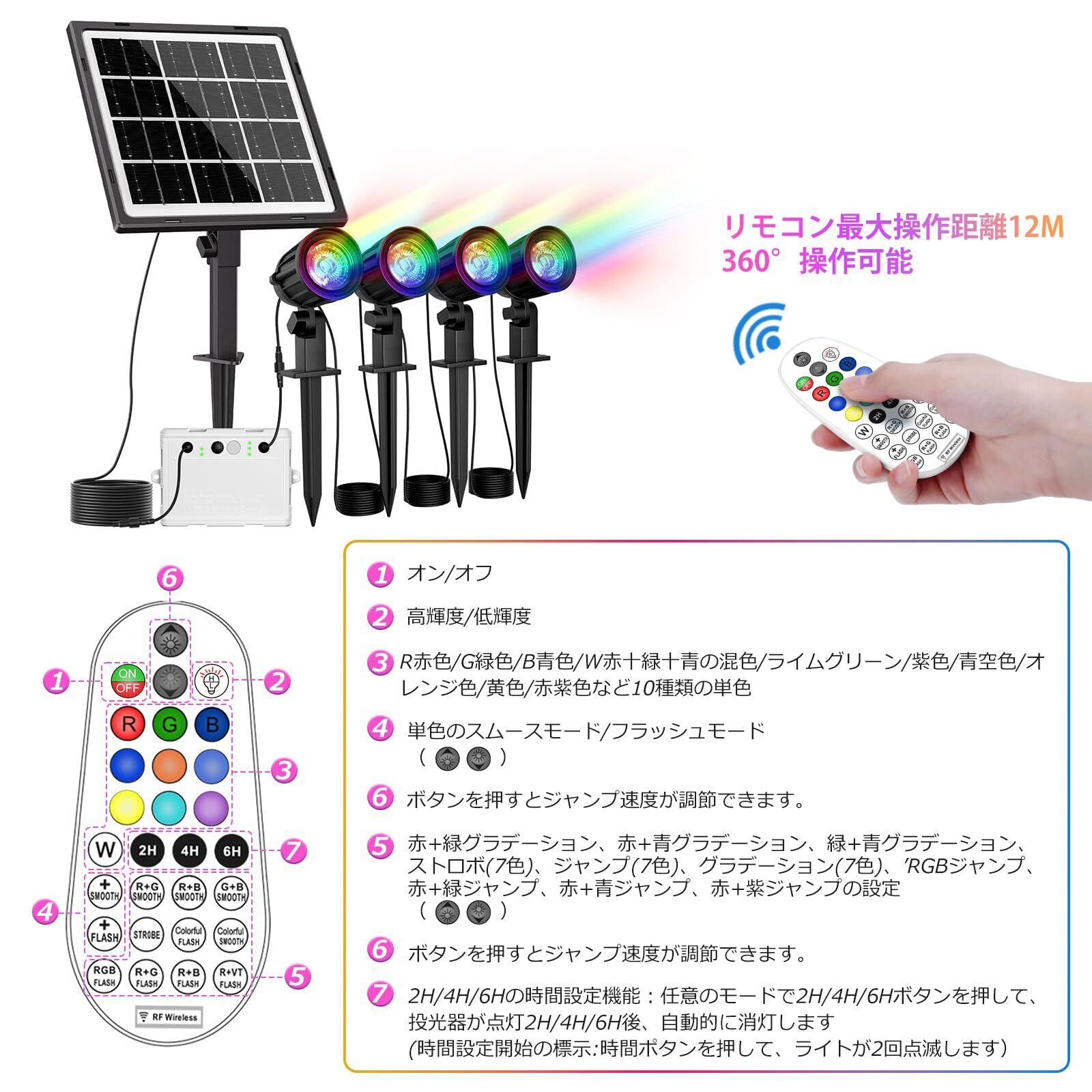 CLY ソーラーライト 屋外 ガーデンライト ソーラー RGBライト カラーライト スポットライト LED雰囲気ライト 庭園灯 RGB看板灯 パスライト 景観照明 舞台照明 リモコン付き 10色切替 輝度調節 自動点灯/消灯 電気代不要 IP66防水 イルミネーション 看板照明 クリスマス 誕生日 ハロウィン バースデー 新年 パーティー 庭 飾り アクアリウム用 雰囲気作り 4灯式