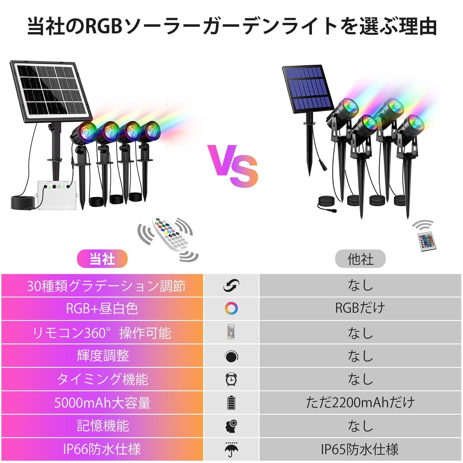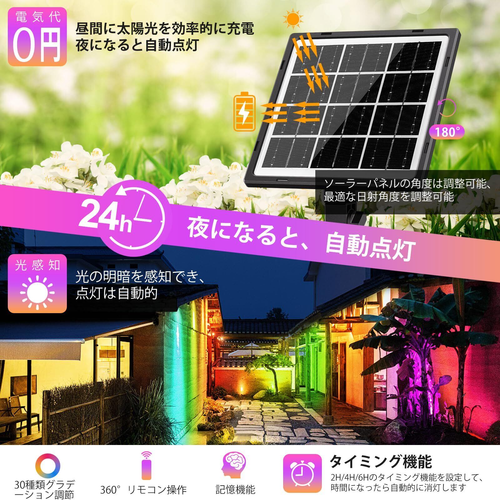 ️【最新の分離式RGBソーラーガーデンライト|電気代不要|10色切替&輝度調節】業界初登場の4灯式の分離式RGBソーラーガーデンライトは赤R、緑G、青Bの3原色を利用して、10色を表現することが可能で、さまざまな夜の雰囲気を楽しめます。または点灯パターンも二モード操作(フラッシュ/スムース)あるので、シーンに合わせて選ぶことができます。10色切替可能なので四季に合わせて照明を変えたり用途によって、カラーを自由的に変化できます。または普段照明用の純色照明を調節して、日常の庭の照明用ライトとして利用できます。単色の明るさも簡単に調節できますので、場所や目的に合わせて使えます。さまざまな照明効果を設定できます。分離式ソーラー充電で、日当たりのよい庭でソーラーパネルで充電し、かげになりがちのところの夜間照明できます。ソーラー充電しきて太陽光で充電でき、配線の必要がなく設置に自由が効くこと、それに電気代がかからないです。美しい雰囲気を作り出すの同時に家計を節約できます。