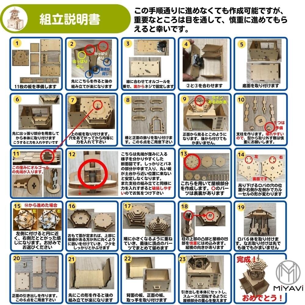 パーツが繊細で壊れることがあります。弊社は全てのお客様に完成させていただきたいと切に願っております。そのため、万一作成途中で破損したり、オルゴールが動かなくなった場合は販売元へのお問合せか、付属のカードの連絡先へとご連絡をお願いいたします。弊社MiYAViのパズルシリーズは全てのお客様のお問い合わせに真摯にお応えしております。