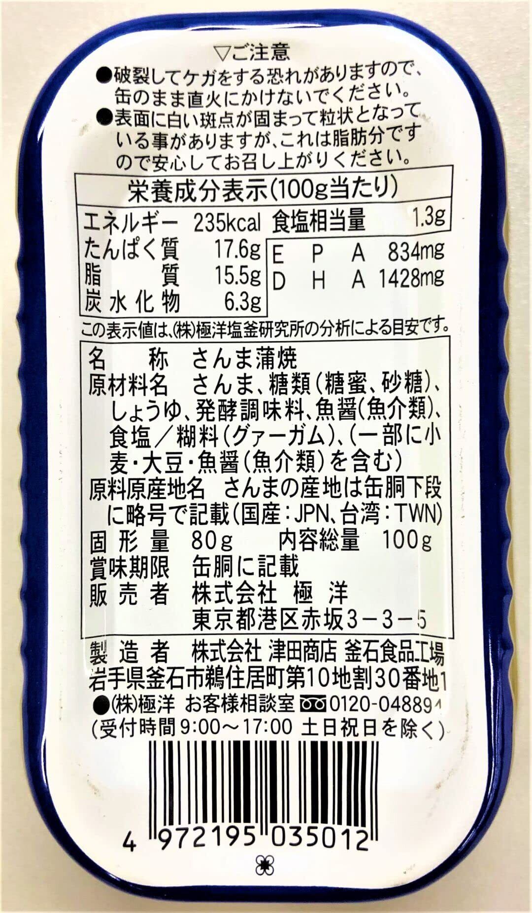 さんま、糖類(糖蜜、砂糖)、しょうゆ、発酵調味料、魚醤(魚介類)、食塩/糊料(グァーガム)、(一部に小麦・大豆・魚醤(魚介類)を含む)、さんまの産地は缶底右側に略号で記載(国産:JPN、台湾:TWN)