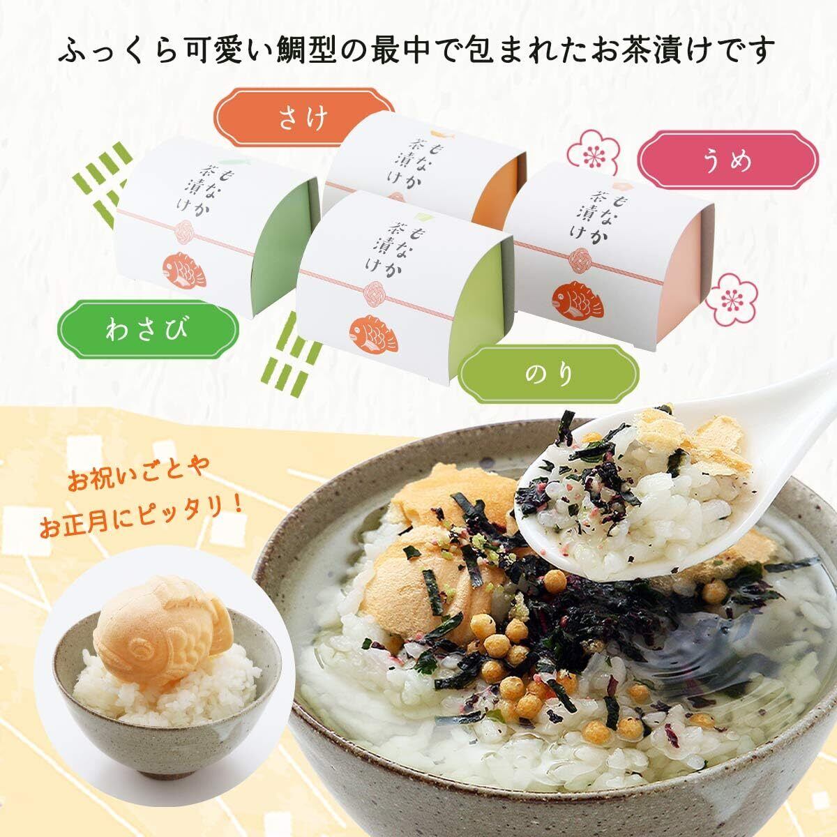 ふっくら可愛い鯛型のもなかでお茶漬けを包みました。 ふっくら可愛い鯛型の最中で、のり・さけ・うめ・わさびの4種類のお茶漬けを包みました。 見た目のインパクトが抜群で、お子様からご年配の方まで喜んでいただける贈り物です。 ぷくっとまんまるなフォルムに笑った目が特徴的なデザインの鯛なので、ファミリーや目上の方へのプレゼントにも喜ばれます。 もなかは国産のもち米を使用しており、きつね色に焼き上げられたことで香ばしい仕上がりです。 縁起のいいお茶漬けをお楽しみください。 ちょっとしたプレゼントや、お返しなどにもお使いいただける、かわいらしい包装も魅力的です。