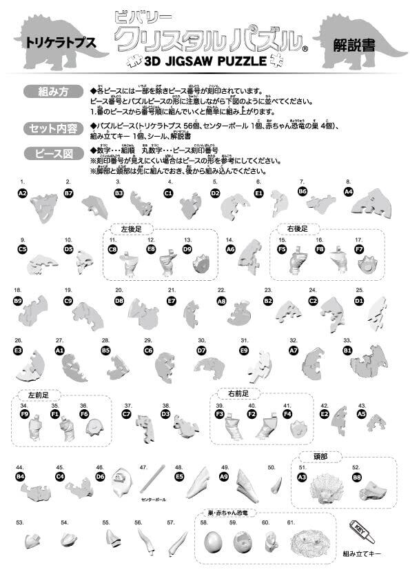 パズルピース(トリケラトプス56個、センターポール1個、赤ちゃん恐竜の巣4個)、組み立てキー1個、シール、解説書